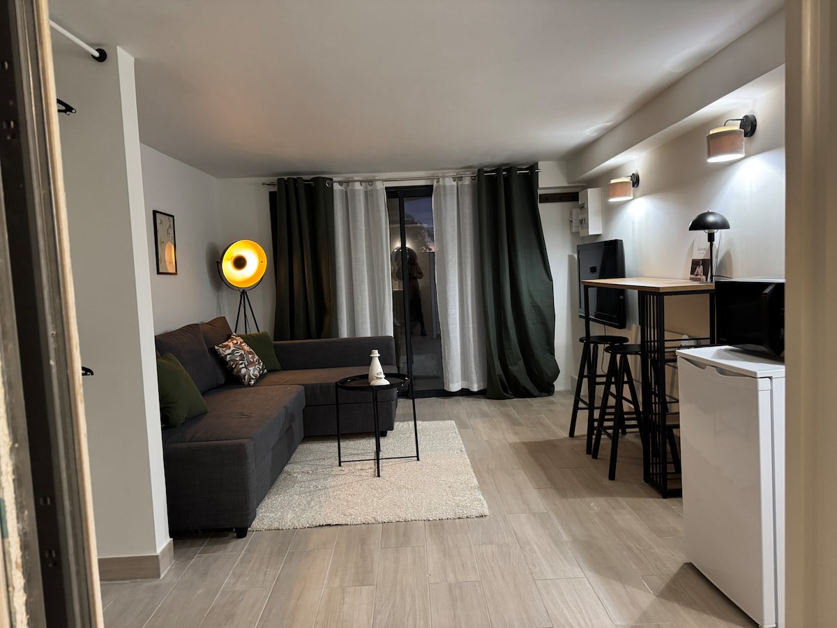 Le damos la bienvenida con mucho gusto a este estudio reciente, independiente de nuestra casa (solo la entrada de vehículos es común), decorado con atención. Este se compone de una parte de noche con una cama de 180 cm que se puede dividir en 2 camas de 90 cm. El estudio dispone de una zona de escritorio, una cocina equipada con nevera, microondas grill, cafetera, hervidor de agua… La entrada al jardín está en pendiente. Tenemos en nuestra casa un perro que podemos encerrar si es necesario.
