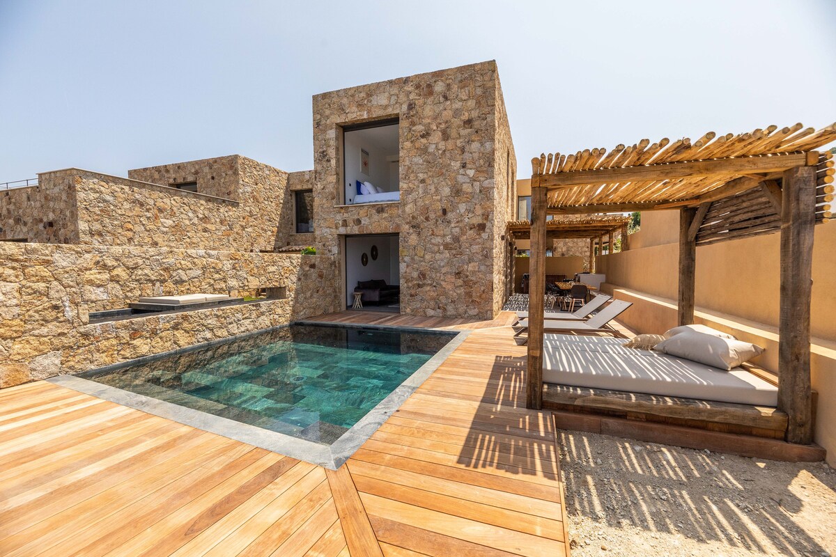 Residencia de piedra entre el mar, la montaña y la piscina.