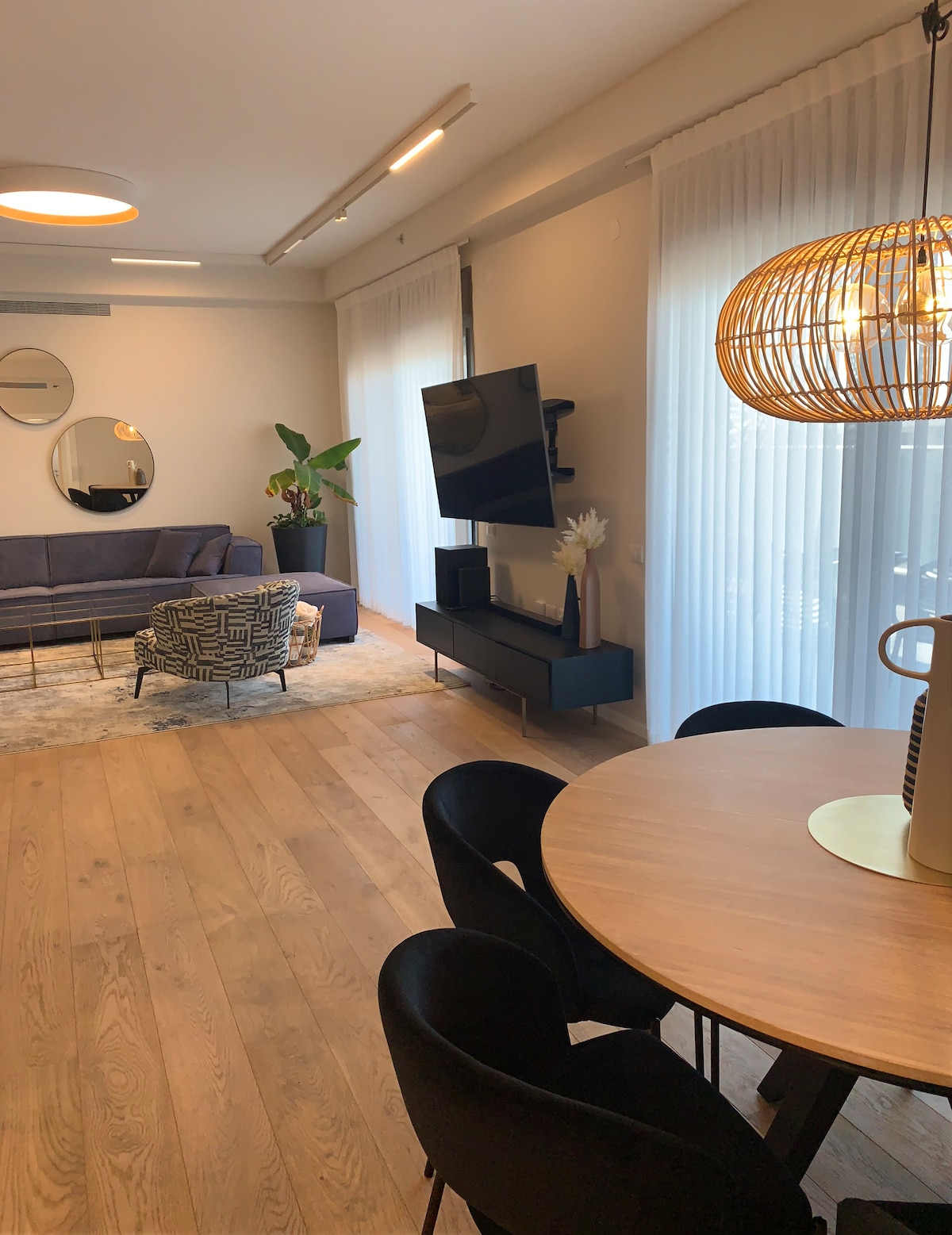 Welcome to this elegant and thoughtfully designed apartment in the heart of Herzliya. With stylish contemporary furniture, warm yellow accents, and curated lighting and artwork, the space feels both modern and inviting. Perfectly suited for up to four guests, it offers two spacious bedrooms, each with twin beds and ample storage — ideal for families, friends, or business travelers.