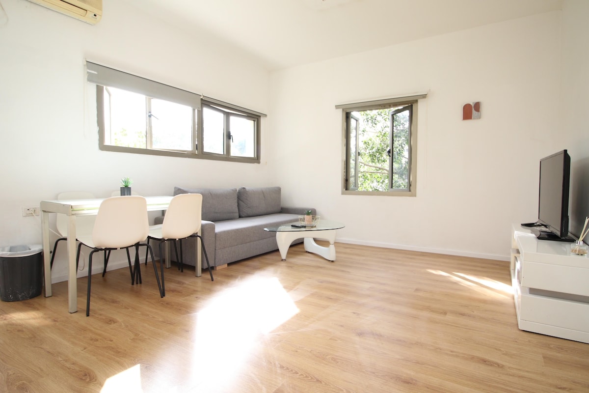 Elegante apartamento en Tel Aviv con jardín privado: apartamento de dos habitaciones luminoso, limpio y espacioso en la mejor ubicación de la ciudad. A pocos pasos del mercado del Carmel, Nahalat Binyamin y la playa. Diseñado para la comodidad y el estilo, con un tranquilo jardín privado perfecto para el café de la mañana o una copa de vino al atardecer. La combinación perfecta de energía urbana y refugio tranquilo en el corazón de Tel Aviv.