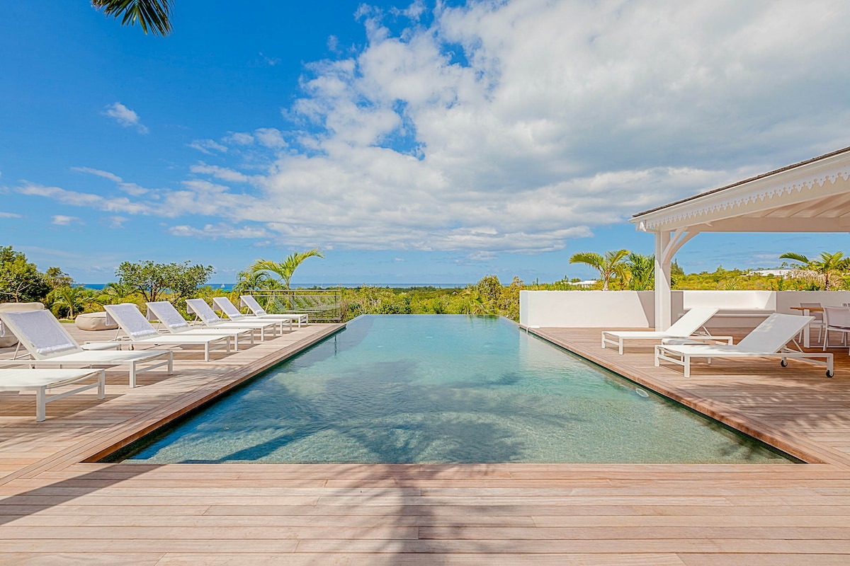 The picturesque approach to Belle Fontaine sets the mood for this elegant French Provence meets Creole style villa. A long stone walled drive, lined with tropical flowers and shrubs, brings you to the entrance filled with architectural beauty. Coral stones embedded with colorful ceramic tiles, Moorish inspired arches and windows trimmed in blue, country style shutters and terracotta roof offer an exotic tropical welcome. From the moment you step inside, the view spans before you. Swaying palms frame the sapphire blue sea, endless sky and the outline of Saba. Colorful tropical gardens surround the house and deck. The mood is very peaceful. Set in expansive epi wood, the new double pool dazzles in blues. The smaller pool is inset with a tiled table, just waiting for your cold beverage. The larger pool is for swimming under the Caribbean sun. Surrounding the pool is crisp blue and white deck furniture that perfectly complements the view. Tall palms and native boulders accent the deck. A large gazebo, set to one side of the terrace, contains generous seating for lounging and dining, plus a built in BBQ. It’s a superb place to relax and watch the colorful sunsets. The cool interiors are designed to take full advantage of the view. Floor to ceiling glass doors, terracotta floors, high vaulted ceilings and arched windows accent the spacious areas for seating and dining. The décor blends modern exotic lines with the softness of Provence. Rattan, teak and bleached woods are adorned with white and blue fabrics. Underfoot, oriental carpets add exotic color; eclectic decorative pieces complement the mood. The large, well equipped kitchen has a French country attitude. Large arched windows bring in the view and connect the kitchen to the terrace. Although quite secluded you are close to the Terres Basses beaches. You are two minutes to Baie Nettle and seven minutes to the charming French capital of Marigot with restaurants, the Creole Market, galleries and shopping. It’s a 10 minute drive to the airport and 30 minutes to both Grand Case and Phillipsburg. BEDROOM & BATHROOM • Bedroom 1: King size bed, Ensuite bathroom with stand-alone rain shower, Dual vanity, Smart TV • Bedroom 2: King size bed, Ensuite bathroom with stand-alone rain shower, Dual vanity, Smart TV • Bedroom 3: King size bed, Ensuite bathroom with stand-alone rain shower, Dual vanity, Smart TV • Bedroom 4: King size bed, Ensuite bathroom with stand-alone rain shower, Dual vanity, Smart TV • Bedroom 5: King size bed, Ensuite bathroom with stand-alone rain shower, Dual vanity, Smart TV FEATURES & AMENITIES • Wine cooler OUTDOOR FEATURES • Outdoor living space • Gazebo STAFF & SERVICES Included: • Caretaker - lives on-site • Gardener • Pool maintenance • Welcome basket • Welcome toiletries Extra cost (advance notice may be required): • Additional housekeeping