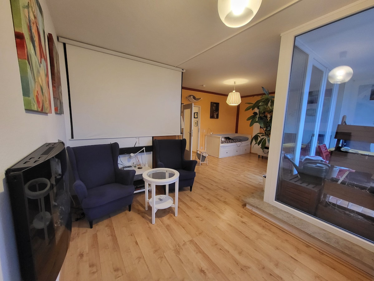 Apartamento en planta alta con muebles de alta calidad. El apartamento ofrece cocina, baño, sala de estar y terraza. El dormitorio con una cama doble grande se puede separar del área de trabajo y sala de estar con una cortina. El baño y la sala de estar ofrecen vistas al tranquilo y verde patio interior. Ducha a ras de suelo, calefacción por suelo radiante, TV y proyector con pantalla extensible completan la imagen. El aparcamiento es gratuito en la calle. Plaza de aparcamiento en garaje a petición. Todas las ventanas tienen cortinas o persianas.