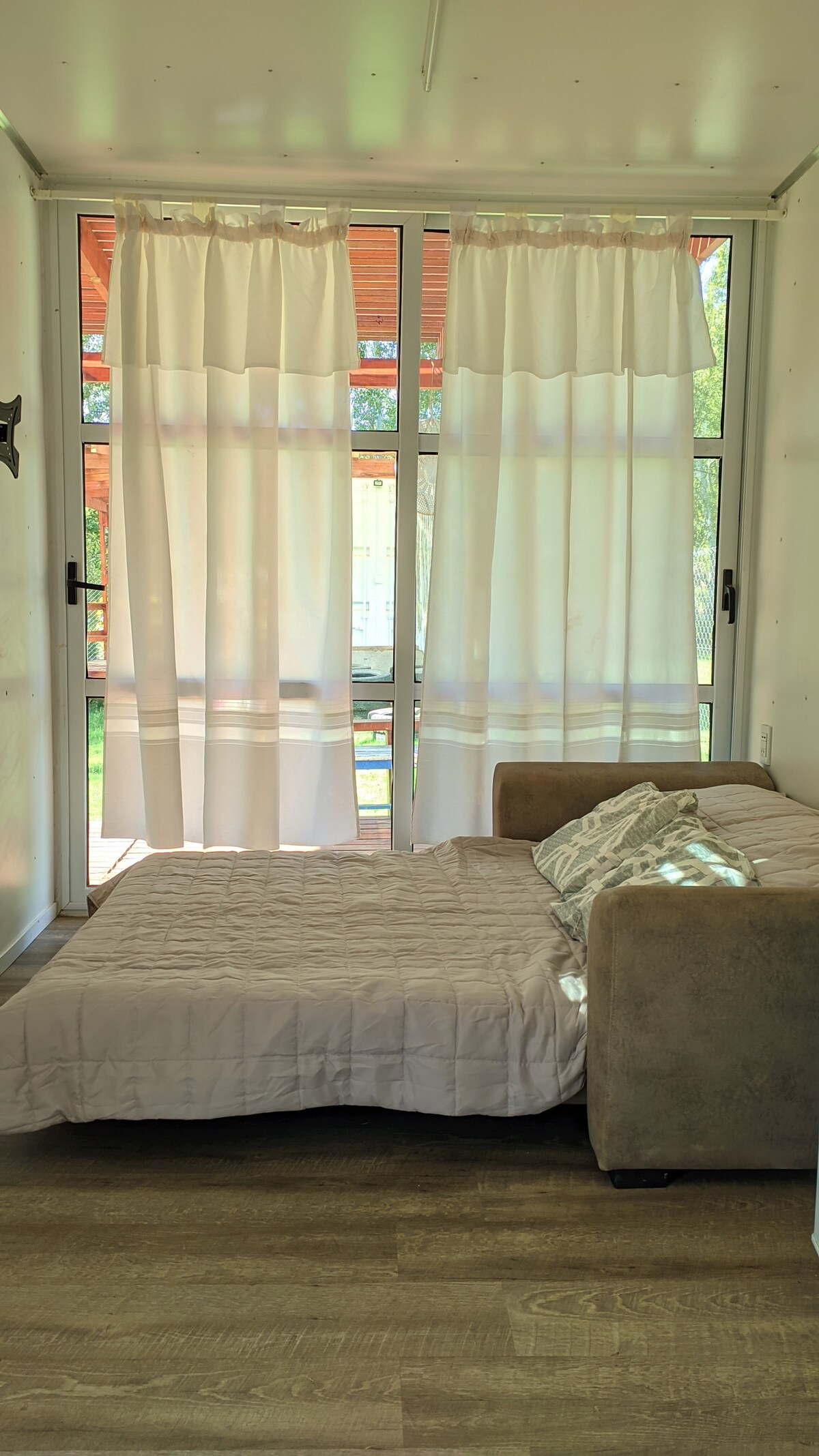 Ecocubo es una propuesta de alojamiento sustentable en contenedores marítimos reciclados sin resignar ningún confort. Esta unidad completa de 40 pies (28m2) cuenta con un baño completo, un dormitorio matrimonial con sommier, un segundo dormitorio con 2 camas individuales, calefacción por radiadores, aire acondicionado, cocina básica, refrigerador, sillón, tv led y aire acondicionado.