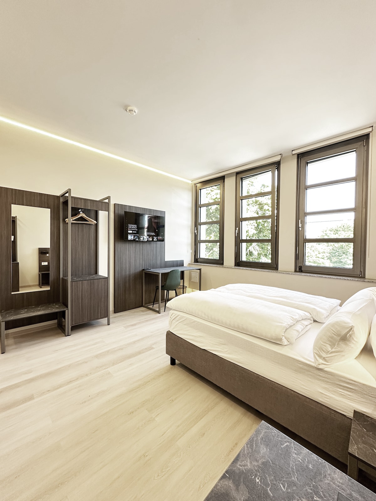 Las habitaciones de Urban Loft Cologne son elegantes, modernas y cuidadosamente diseñadas para ofrecer comodidad y funcionalidad. Con una decoración industrial minimalista, cada habitación incluye una lujosa cama con sábanas de alta calidad, una amplia ducha de efecto lluvia, TV inteligente, aire acondicionado y ventanas insonorizadas. La luz natural, los servicios sostenibles y las obras de arte locales seleccionadas agregan un toque cálido y personal, lo que hace que cada estancia sea relajante e inspiradora.