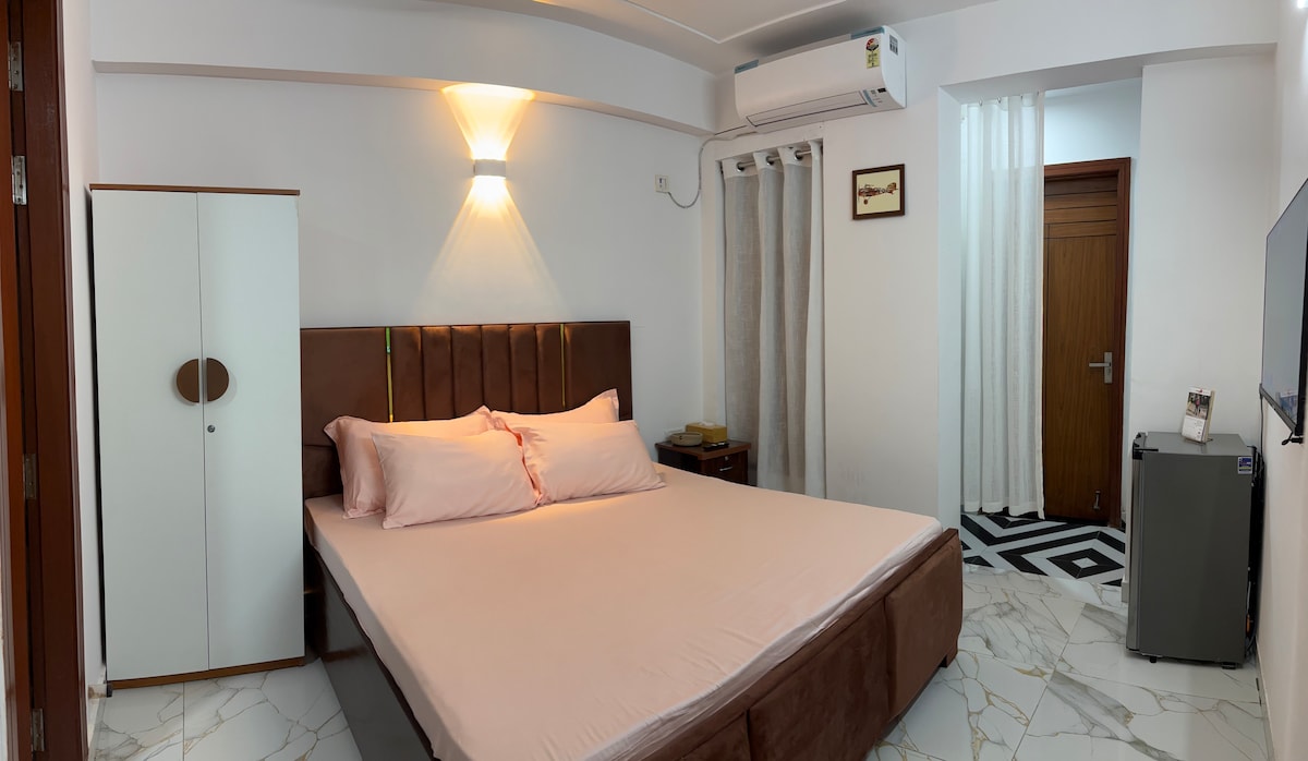 - Departamento de 1 dormitorio, sala de estar con cocina pequeña y baño adjuntos. - Todos los servicios necesarios para una experiencia sin complicaciones. - Completamente equipado con electrodomésticos y utensilios esenciales. - Toallas y artículos de tocador frescos. - Wifi con TV de 55 pulgadas (incluido Netflix, Amazon Prime y Hotstar, etc.). - A 6 km del aeropuerto IGI, Nueva Delhi. - A 1,3 km de la Indian Aviation Academy. - Centro de lesiones espinales indias de 1,4 km. - 3 km DLF Emporio Mall, Vasant Kunj. - A 4 km del Hospital Fortis, Vasant Kunj.