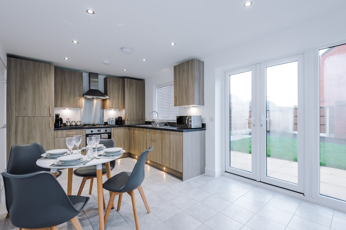 Casa independiente de 3 dormitorios en un lugar tranquilo a las afueras del Barrio Norte de Manchester. Cada habitación doble tiene TV, almacenamiento y espejo de cuerpo entero. Dos están en suite; el tercero usa el baño principal. Cocina/sala de estar/comedor de planta abierta con wifi rápido y un espacio de trabajo dedicado. Incluye un garaje privado (raro que esté cerca de la ciudad) más un espacio de estacionamiento adicional. Llegada autónoma. Camina hasta Ancoats, Cutting Room Square y algunos de los mejores bares y restaurantes de Manchester.
