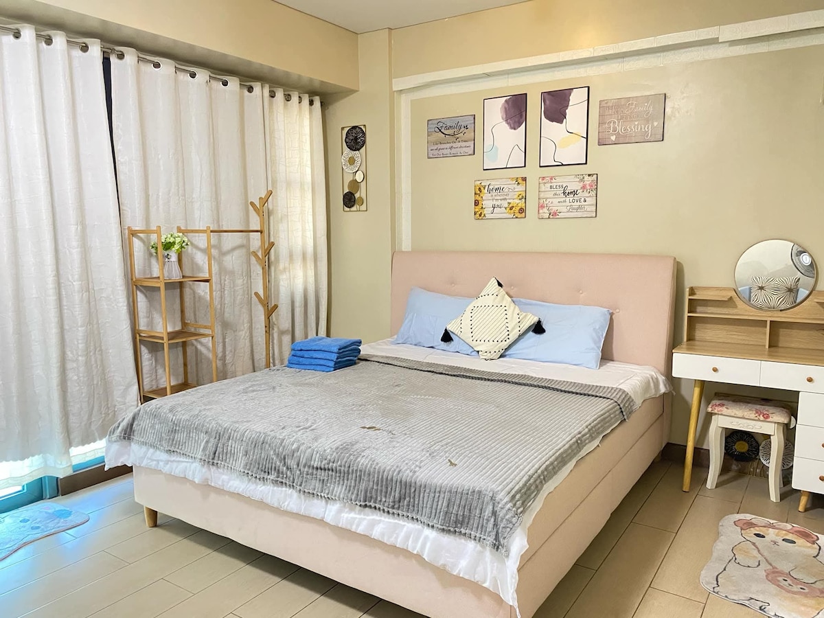 Acogedor estudio en esquina a solo 5 minutos de la Terminal 3 de NAIA y Runway Manila. Disfruta de un espacio luminoso con vistas al aeropuerto, una cómoda cama, una televisión inteligente con Netflix gratuito y wifi rápido. Los huéspedes también tienen acceso gratuito a la piscina, el gimnasio y el parque infantil, por lo que es perfecto para escalas, escapadas rápidas o estancias en la ciudad.