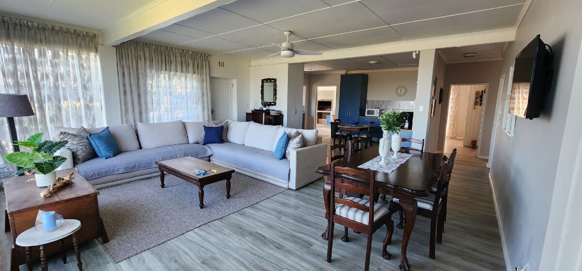 Una casa de campo de planta abierta, enfrente de la playa. Situada en un hermoso jardín seguro adecuado para el juego de los niños y con estacionamiento seguro. Al otro lado de la carretera de la playa, rutas de senderismo, paseos a caballo y un campo de golf. Este pueblo costero ofrece un kwikspar, una tienda de regalos, el MUSEO DE CONCHAS más grande de Sudáfrica, una biblioteca, un puente a la hermosa costa salvaje de Transkei, un crucero en ferry por el río Kei, carnicería, pesca, cancha de tenis, bolera y restaurantes. ¡Un lugar para recargar las pilas!