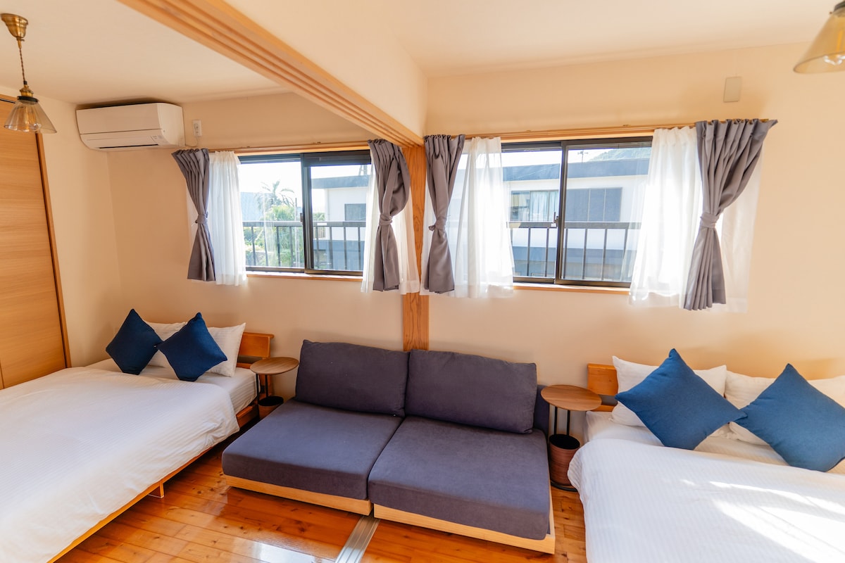 Si visitas Aoshima con la familia, ¡este es el lugar para alojarse! A solo 15 minutos del aeropuerto de Miyazaki, esta casa en un barrio tranquilo es perfecta para una estancia relajante. Tiene juguetes, una sala de juegos con temática de campamento y un amplio jardín, ideal para familias con niños. Disfruta de paseos junto al mar, observa las estrellas y aléjate de la ciudad. La playa está a 10 minutos a pie, con zonas de surf y campos de golf cerca. Estacionamiento gratuito para dos autos. Nos encantaría que te quedaras al menos 3 noches para disfrutar del encanto de Aoshima.