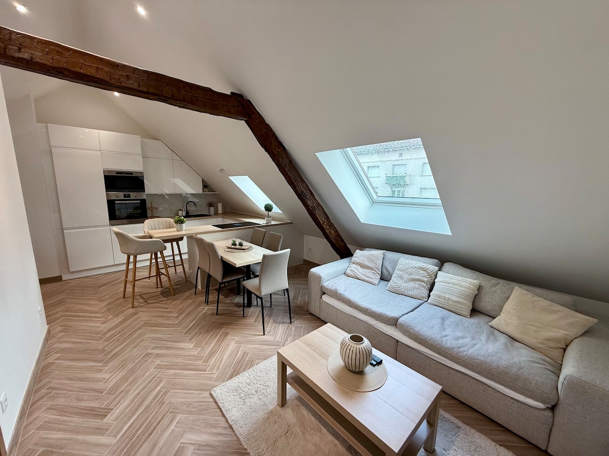 Bienvenue dans ce cocon moderne et chaleureux, niché sous les combles, alliant confort contemporain et charme des poutres apparentes. L’appartement offre une atmosphère lumineuse et apaisante, idéale pour se détendre comme pour travailler dans de bonnes conditions. Que vous soyez en déplacement professionnel, en escapade romantique ou en séjour en famille, ce logement saura parfaitement répondre à vos attentes.
