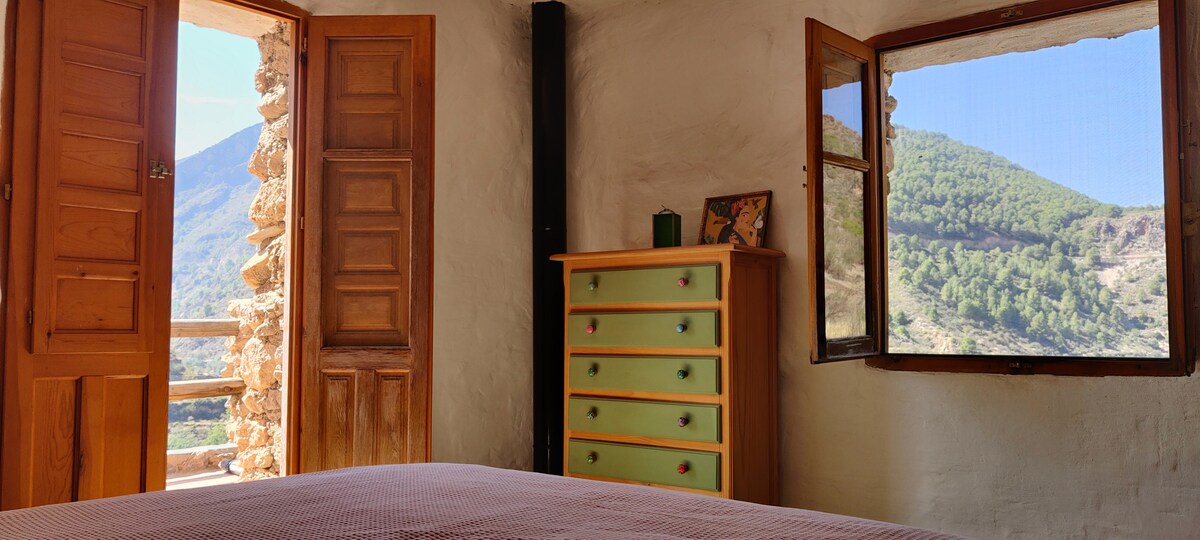 Casa en La Alpujarra Árabe, ubicada en El Barrio más antiguo de Capileira, el lugar más tranquilo y mágico del pueblo. Rodeada de sonidos de fuentes, acequias, montañas, rutas de senderismo y el Río Poqueira. La casa consta de dos plantas. Arriba hay un dormitorio con baño en suite, terraza con vistas a la montaña, Salón con chimenea y dos sillones-cama. Abajo hay otro salón-comedor con cocina americana y estufa de leña. Totalmente equipada y con WIFI. No calefacción. Solo chimeneas. No hay TV.