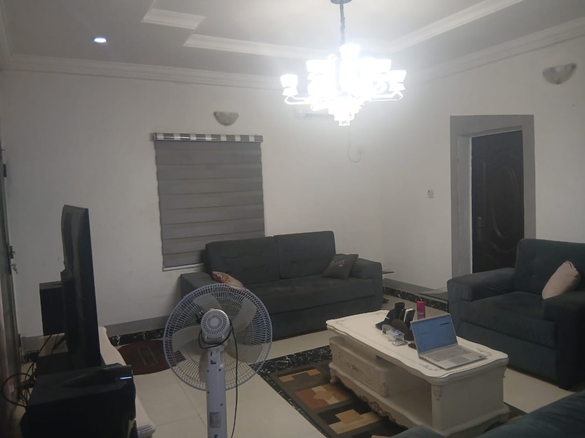 - Electricidad 24/7- (AEDC/INVERSOR /GEN) - Cocina pequeña totalmente equipada. - Sala de estar amueblada. - Dormitorio amueblado - Acondicionador de 1 aire. - Proximidad a supermercados, escuelas y restaurantes. - Ropa de cama y toallas limpias y limpias. - Excelente servicio de atención al cliente y asistencia. - Servicio de limpieza regular: vecindario tranquilo, seguro y hermoso. Televisor inteligente de 43 pulgadas (DSTV, Netflix) Cama tamaño king con wifi de fibra óptica
