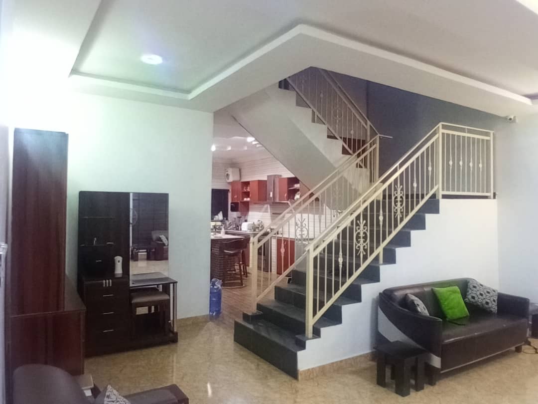 Una casa de 3 dormitorios elegante y masiva + con todas las habitaciones en suite y amueblado con camas y armarios, con dos aseo, calentadores de agua, cocina equipada y totalmente equipada con todos los electrodomésticos de cocina estándar, extractor de humo, amueblado gran salón con comedor ejecutivo, generador de Mikano, perros de seguridad (opcional), amplio espacio de embalaje, flores, cámaras de seguridad, puertas de seguridad automáticas, puertas de seguridad, suelos de madera, buen ambiente, todas las habitaciones equipadas con aire acondicionado
