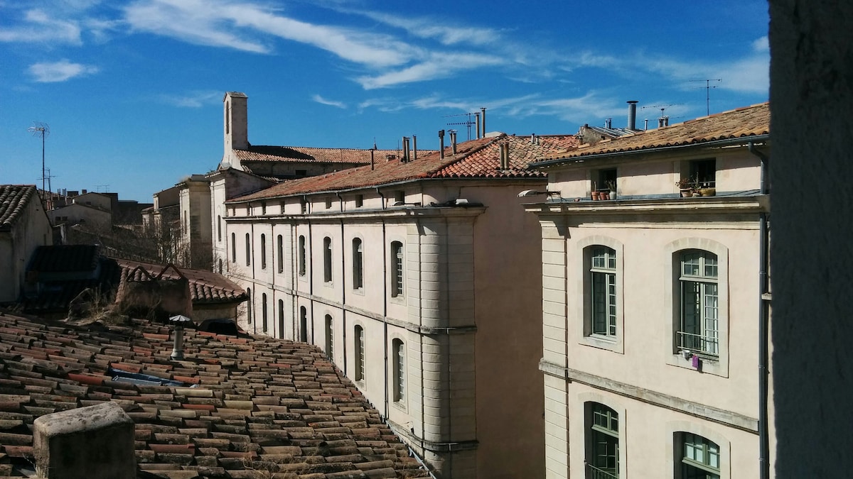Alojamiento atípico y acogedor en los tejados de Nimes en pleno centro (4.ª planta sin ascensor). Se alojará a un paso de los monumentos históricos. Diseñado por nosotros, el «nido» es cómodo y tiene todo lo necesario (aire acondicionado, TV...). Pequeño exterior compartido para fumadores. Posibilidad de aparcamiento con cargo adicional. Discretos, residimos en el mismo piso. Si lo desea, podemos aconsejarle de acuerdo con sus deseos (restaurantes, visitas, salidas, etc.) ¡Hasta pronto!