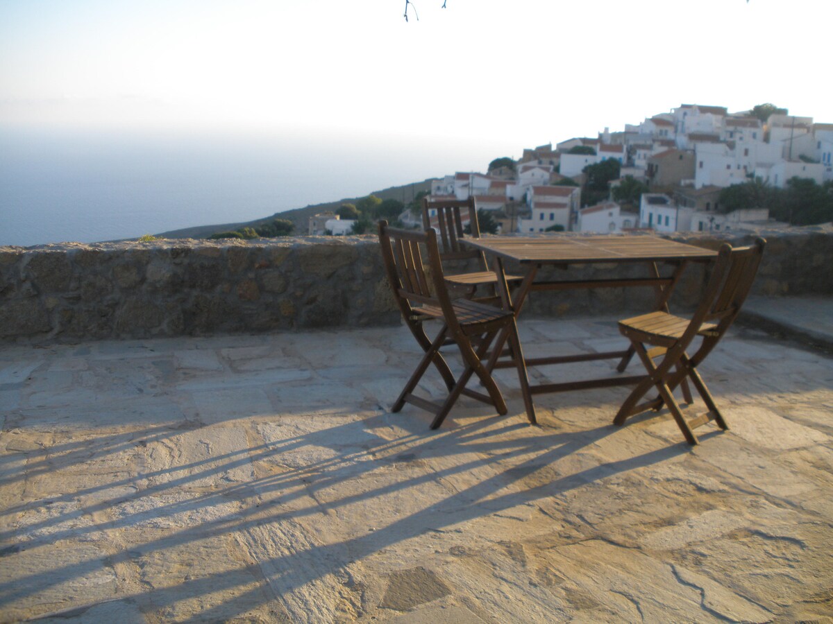 The Traditional Nisyrian house has 3 floors, located in the heart of the center. It is 5 minutes from the harbor and 20 meters from the famous church and central square.The distance is a 1-minute walk from most cafes restaurants and sea with a supermarket in front of the house and the town hall near.It has a terrace with a spectacular sunset and a view of the whole village,with chairs and table to enjoy the view and 2 balconies overlooking the sea.It has 3 bedrooms and 2 toilet-bathrooms.105 s.m