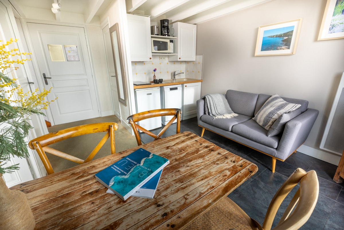 En el corazón del Pornic histórico, a menos de 100 metros de las «halles», de las primeras tiendas, de la panadería y del supermercado. A pocos minutos a pie del castillo, la playa, el puerto viejo y la estación de tren. Encantador estudio de 20 m2 de arquitecto tipo Tiny House. Pequeño, pero muy funcional. Aparcamiento gratuito a 100 metros No le ofrecemos un estudio sin alma, sino nuestro estudio atípico donde vivimos una parte del año.... Vive la experiencia de una «tiny house» en el corazón de Pornic...