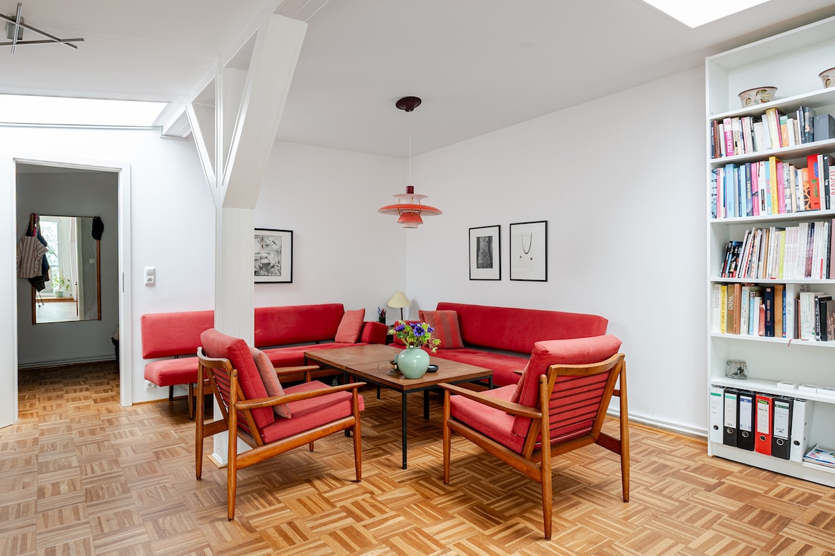 This spacious, loft-style apartment is centrally located between the popular Schanze and Altona neighborhoods, right in the heart of the action yet quietly nestled in a green courtyard. The bedroom offers a relaxing retreat, while the open-concept living, work, and dining area—complete with its own tea and coffee station—invites you to linger. The spacious terrace with a seating area is a wonderful place to relax. The fully equipped kitchen is perfect for both cooking and cozy get-togethers.
