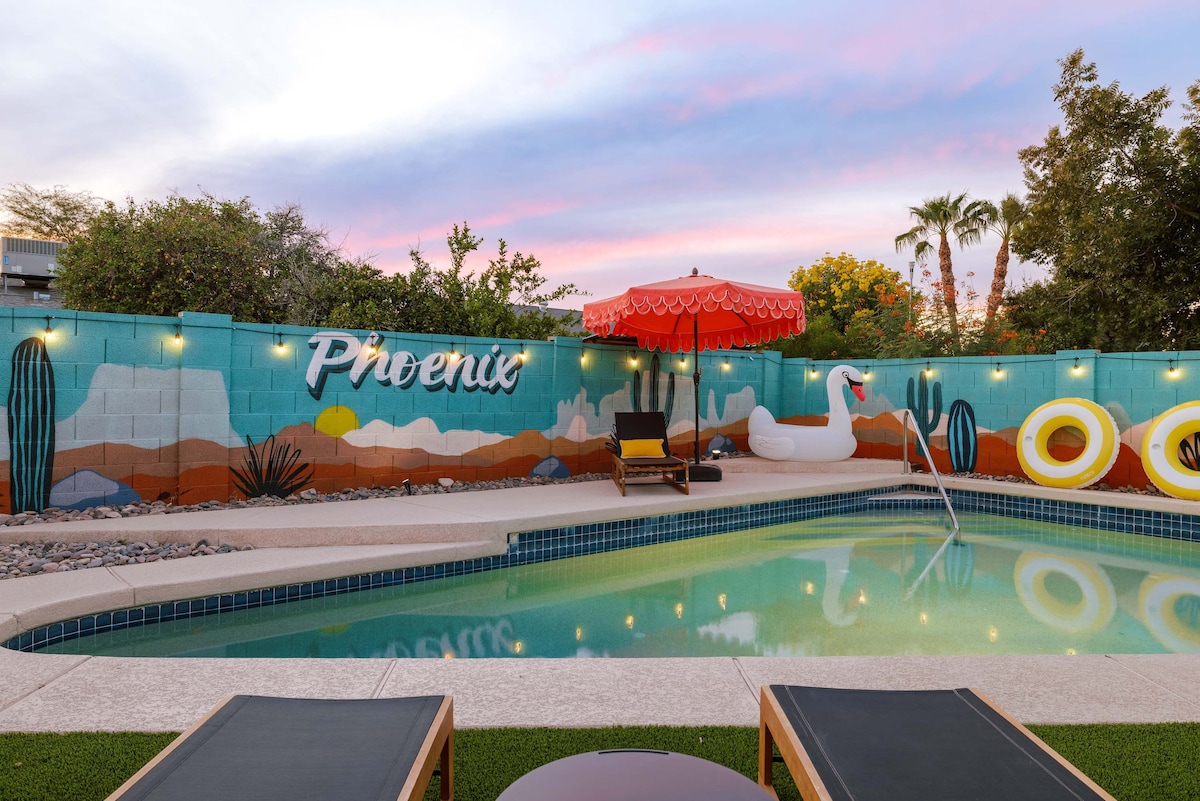 🏊 Relajación durante todo el año en la piscina de agua salada climatizada y en el spa (suave para la piel y los ojos) 🔥 Póngase cómodo con las funciones de fuego 🍳 Cocina totalmente equipada + parrilla de propano al aire libre 🎱 Sala de juegos con mesa de billar, futbolín, dardos y televisor de pantalla grande 🌞 Comedor y bar al aire libre para disfrutar del clima de Arizona 📺 Televisión al aire libre para ver partidos/películas mientras se disfruta del spa 🚗 Fácil acceso a 2 autopistas principales 🎨 Decoración artística y única Escapada estilo resort en Phoenix (correo para Glendale): ideal para familias, viajes de golf y vacaciones