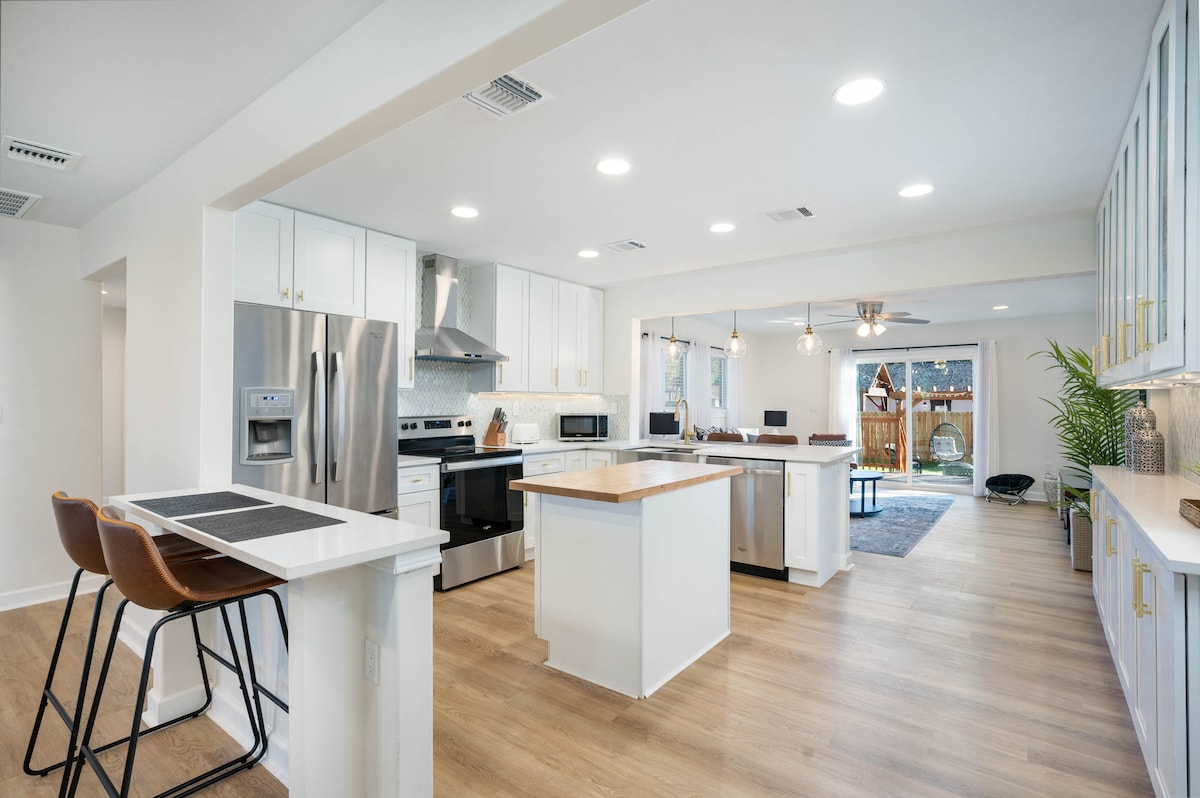 Te damos la bienvenida a tu escapada privada. Esta adorable casa es el lugar perfecto para ti y tu familia. Cuatro dormitorios y una cama principal tamaño king tiene capacidad para 8 personas cómodas. Asa a la parrilla bajo una encantadora pérgola, asa malvaviscos junto a la fogata y relájate con familiares y amigos en este espacioso refugio en el patio trasero con muchos asientos y cómodas sillas columpio. La sala de juegos con Air Hockey y amplios asientos interiores/exteriores proporciona el lugar perfecto para el entretenimiento de su familia.