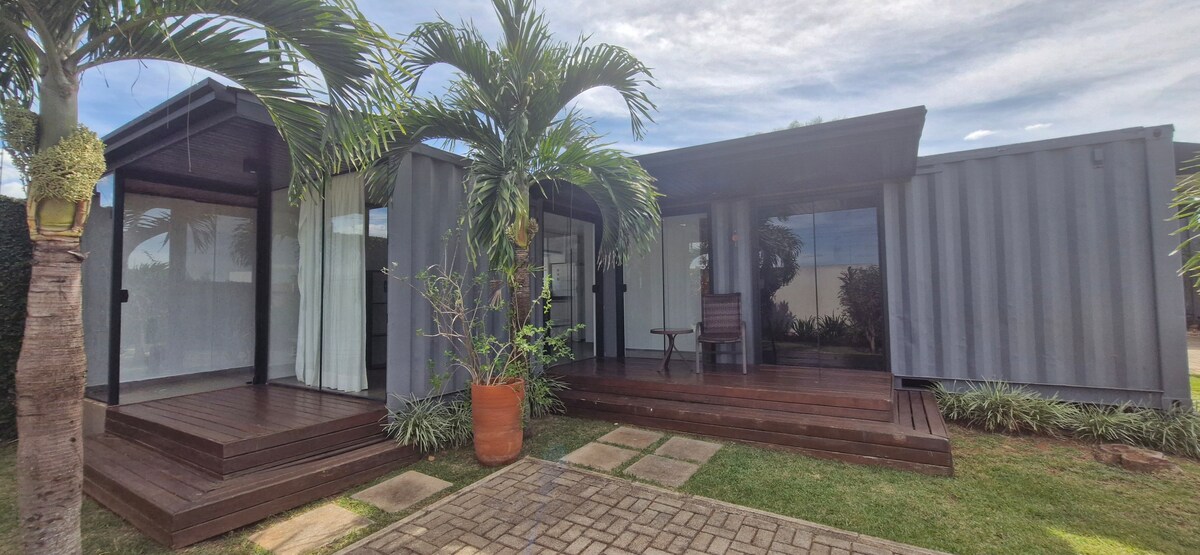 Hermosa casa de contenedores, con un dormitorio, armario, baño, cocina americana, sala de estar y balcón. Todas las habitaciones tienen taquillas planificadas y aire acondicionado. Tenemos una zona de servicio externa. Televisión con cable y wifi Ubicado en un condominio cerrado, que tiene una zona de ocio con parque infantil, pista de skate y cancha multideportiva. La casa está dentro de una parcela privada,donde vivo con mi familia. La entrada es compartida, pero la casa es totalmente independiente con garaje para 1 coche.