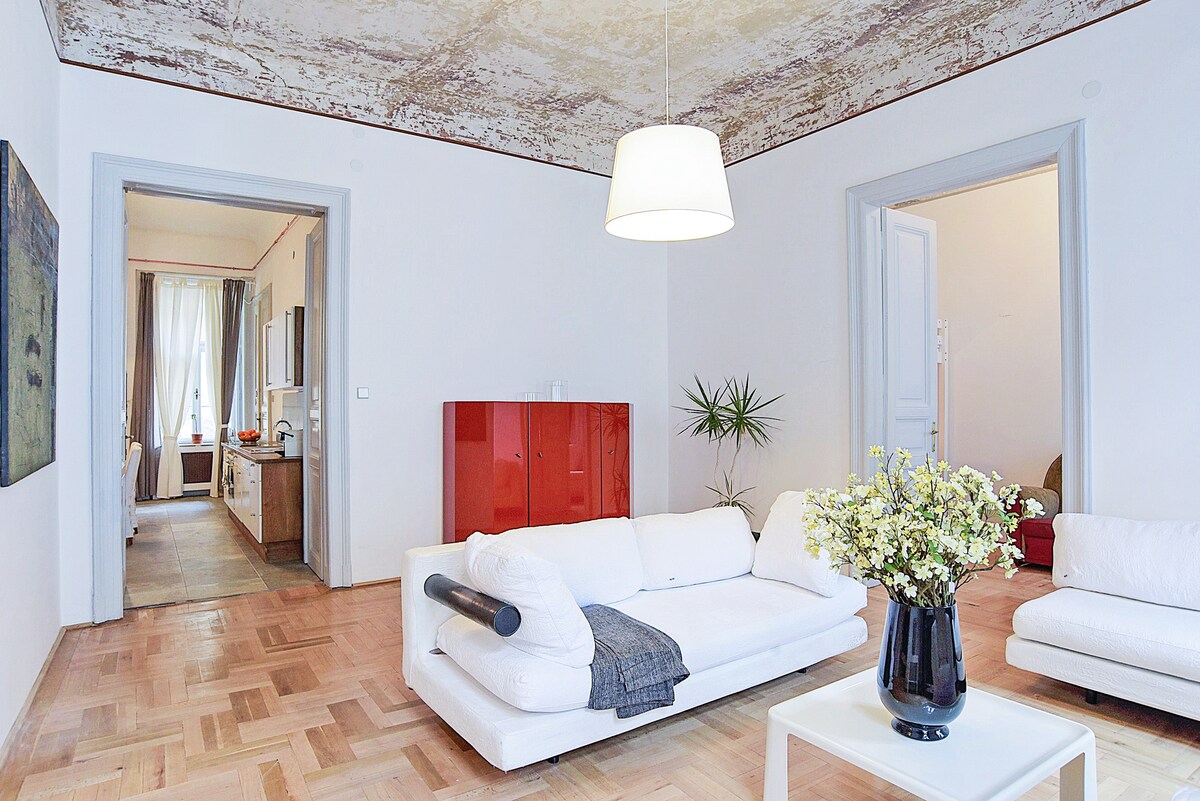 Stay in the very heart of Budapest in this spacious 100 sqm, three-bedroom apartment, comfortably accommodating up to six guests. The unique design and distinctive architectural style create a truly special atmosphere for your stay. Located in a typical downtown Budapest setting, you’ll experience the city like a local. With a major transport hub just steps away, all sights and attractions are easily accessible by public transport.
