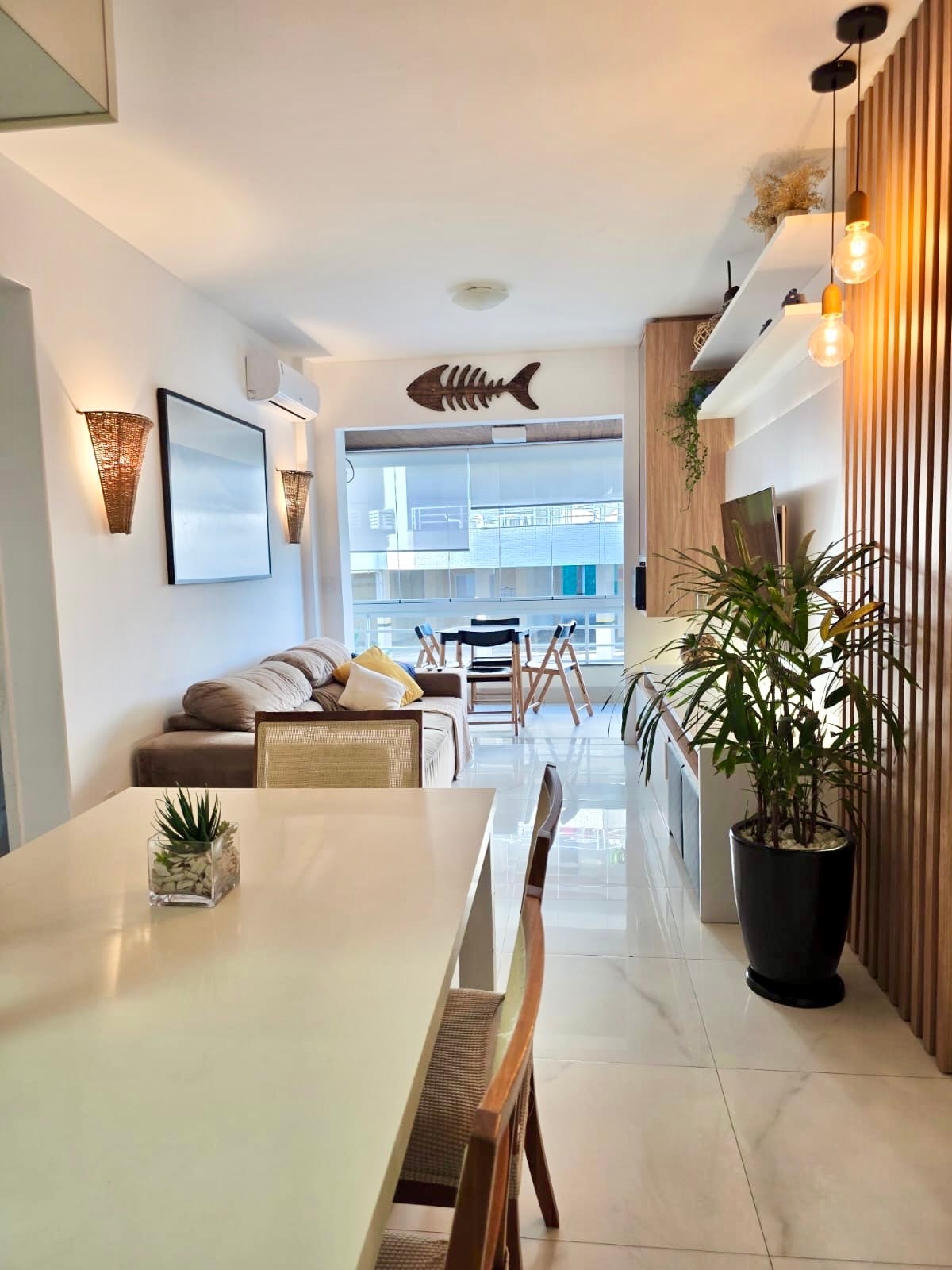 Hermoso departamento ubicado en condominio con SALIDA DIRECTA A LA PLAYA!!!Muy bien amoblado con detalles de decoracion modernos, equipado con vajilla completa. Wifi de alta velocidad. Netflix y YouTube en los dos televisores. Aire acondicionado y ventilador de techo en todos los ambientes. Living comedor con smartTV de 50''. Muy linda vista lateral al mar. Dormitorio principal en suite con TV de 42''. Cama queen. Otro dormitorio con 3 camas de 1 plaza. Lavadero con lavarropas. Cochera cubierta.