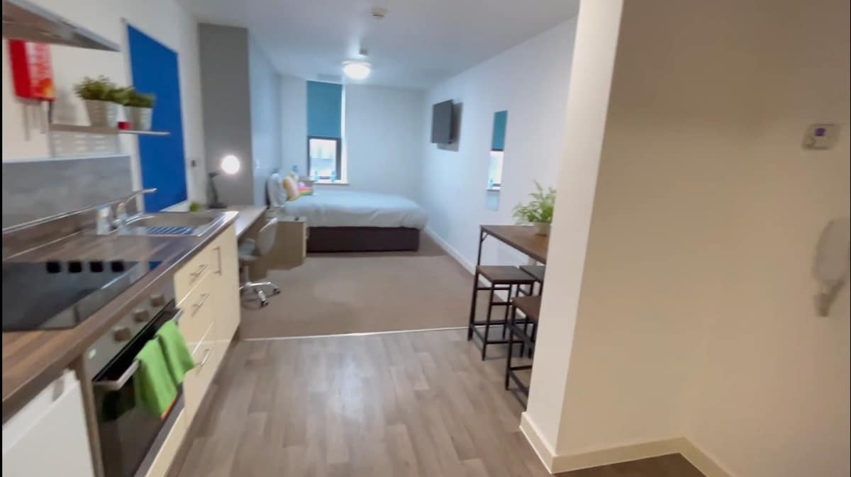 Un estudio moderno en el corazón de la ciudad de Nottingham, en la parte trasera del edificio, por lo que es más tranquilo. A solo 100 metros del Victoria Centre y de Market Square. Cama doble y baño privado, también está equipado con una cocina de alta especificación que incluye placa AEG, lavadora/secadora, nevera y microondas con grill. Cuenta con internet wifi rápido, un pequeño sofá, TV inteligente Samsung 4k de 40 pulgadas montada en pared, mesa de bar con taburetes de cuero. Registro de entrada autónomo y flexible desde la caja de seguridad para llaves en la entrada principal.