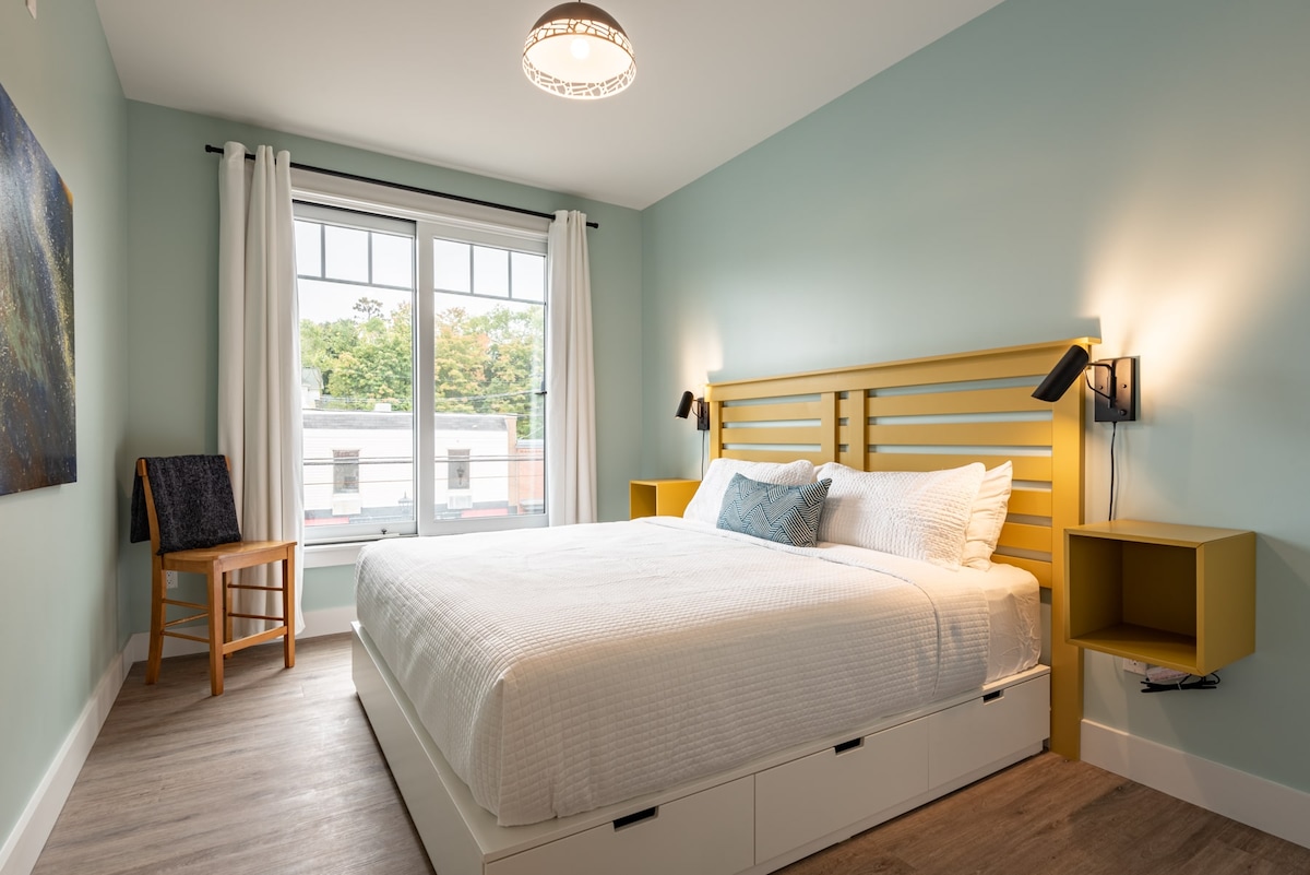 Ubicada en el corazón del centro de Wolfville, la suite 202 es el espacioso alojamiento de DOS dormitorios (1 king, 1 queen) CON BALCÓN perfectamente ubicado para experimentar Wolfville. Nuestra ciudad es excepcionalmente transitable y llena de vibración. Con una cocina completa, cabezal de ducha con efecto lluvia, baño completo y medio baño, TV inteligente de 55 pulgadas, muebles cómodos, lavadora y secadora, grandes ventanales, ¡desearás que nunca hayas tenido que irte! La suite está en el segundo piso, no te preocupes, ya que tenemos un ascensor para mayor comodidad durante tu.
