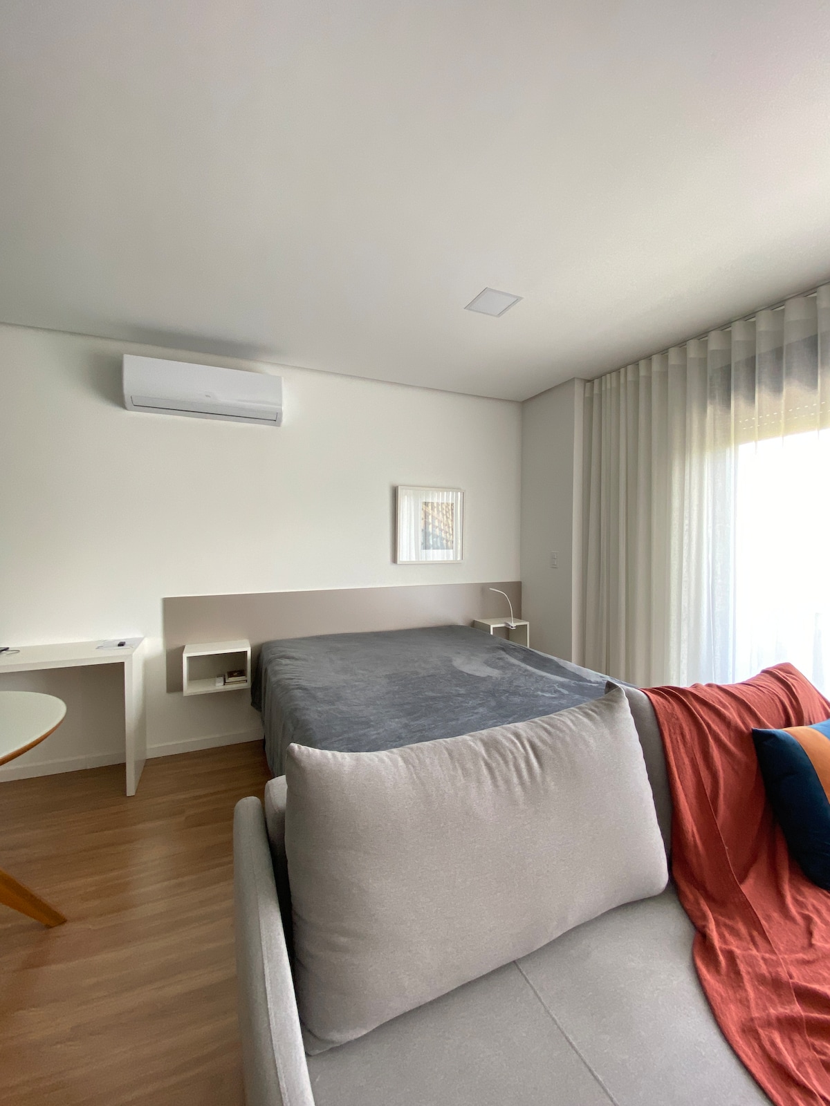 41 metros quadrados * "Pet friendly" * Vaga de garagem, * Prédio todo monitorado por câmaras, * Sacada, * Ar condicionado, * Wi-fi, * Netflix, sinal de tv aberta, * Cozinha com fritadeira elétrica, microondas, fogão a gás, refrigerador duplex, balcão com pia, mesa cadeiras e diversos utensílios domésticos como: pratos, talheres, xícaras panelas, frigideira, e outros mais, * Ambiente de estar com sofá, mesa de centro, * Quarto com cama de casal, cômoda, painel com Tv, * Roupas de cama e toalhas.
