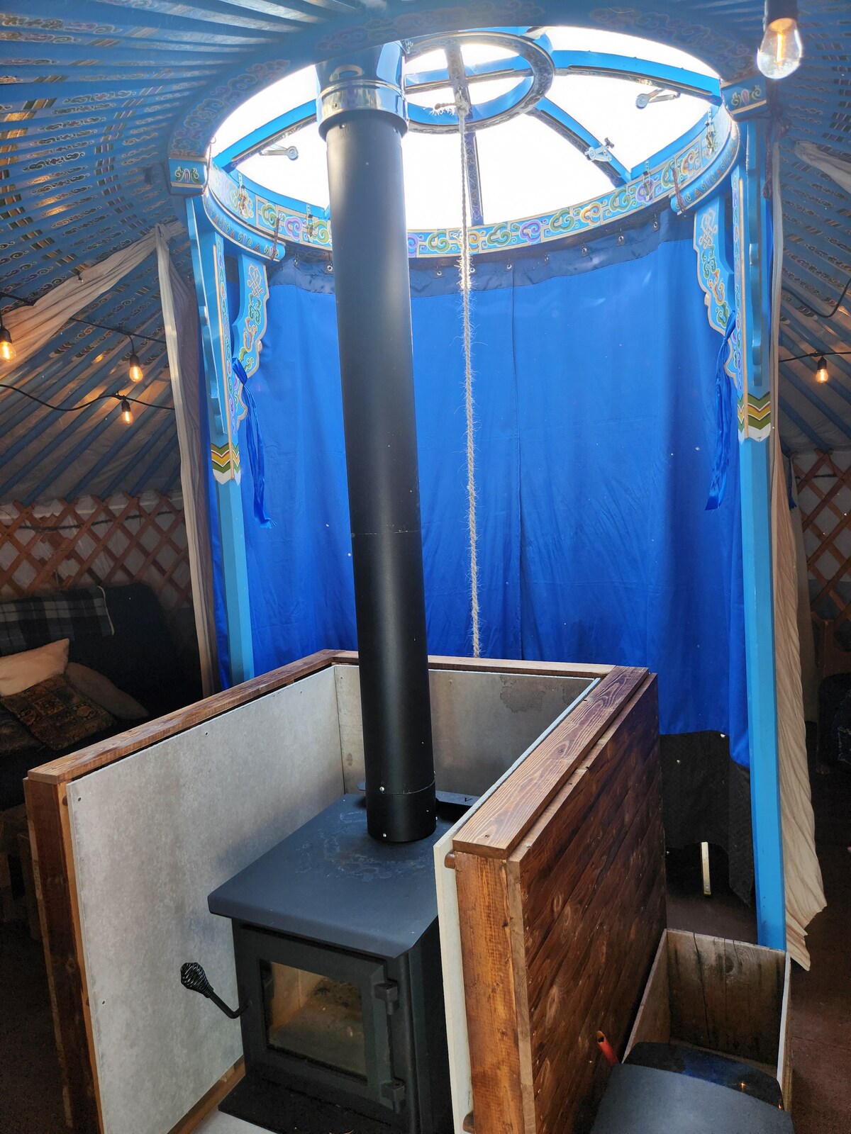 El interior de la yurta Coulee gira en torno a una estufa de leña que se encuentra debajo del toono (cúpula superior) de la yurta. Tiene un área de comedor con una mesa y sillas para hasta seis personas, un área de estar, un área de preparación de alimentos, una cama tamaño queen, dos camas individuales (una es un sofá cama). Cuenta con acceso a Internet de alta velocidad. La zona de cocina al aire libre cubierta tiene una barbacoa de gas y un sistema de agua con un fregadero de acero inoxidable. Consulta la nota sobre los baños más abajo. Este glamping es verdaderamente único y esperamos que lo disfrutes.