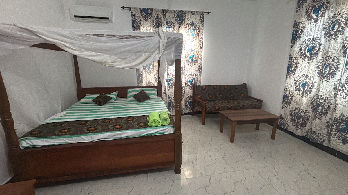 Casa de huéspedes con baño privado, cocina y sala de estar exterior. Jardín grande y piscina compartida (solo conmigo y mi familia). Wifi (20 Mb/s) disponible e incluido. La habitación se limpia una vez por semana para estancias más largas. Y hay una lavadora de uso gratuito si es necesario. Está a 20-25 minutos a pie de la playa de Nungwi o Kendwa, o a 5 minutos en coche o tuk tuk. Te ayudamos a organizar el transporte si es necesario. 😊