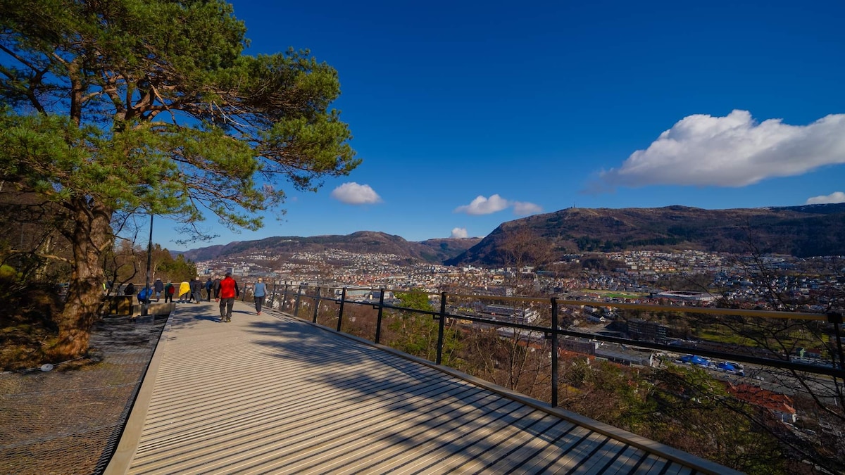 The apartment is situated at Danmarksplass, offering convenient access to the city via public transportation. Alternatively, a 2.5 km walk provides a pleasant commute. Adjacent to the property is the Løvstien hiking trail, extending from Øvre Kråkenes to Milk Place at the base of Løvstakken. This 6.4 km trail boasts stunning views of Byfjorden and Bergensdalen, and features a remarkable 383-meter footbridge spanning from Fredlundsvingen to Kristian Bings vei.