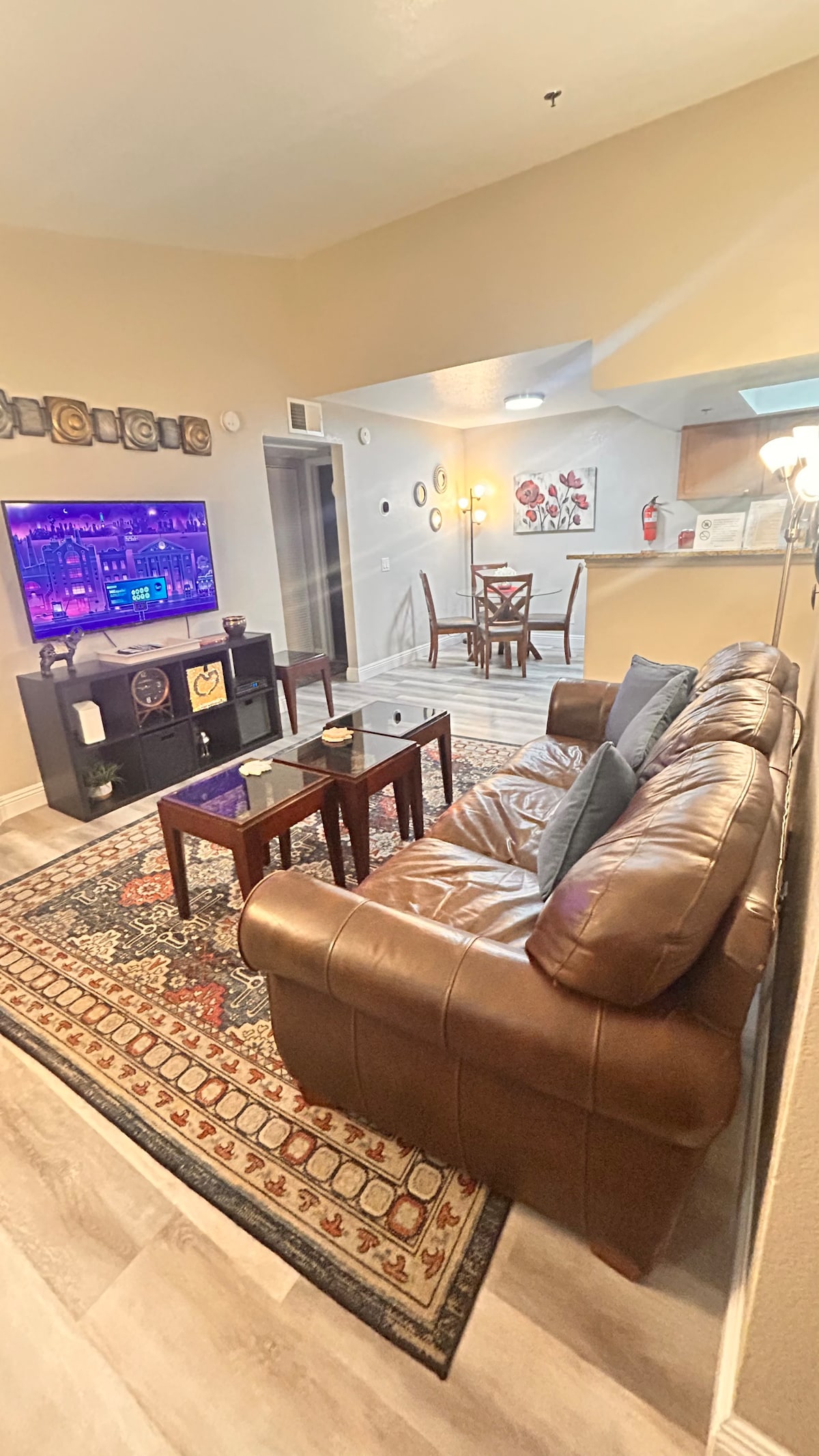¡Mantente con estilo en este apartamento ultramoderno y totalmente amueblado, a solo una manzana de Las Vegas Strip! Se encuentra junto a The Palms y enfrente del Río. Ventilador de techo en el dormitorio y la sala de estar. Wifi, lavadora/secadora, cocina totalmente equipada, nevera, microondas, horno y lavavajillas. Seguridad en el sitio las 24 horas, los 7 días de la semana. Recogida designada con Uber/Lyft en la parte delantera cerca de la casa club. Estacionamiento GRATUITO, sin tarifa del centro vacacional