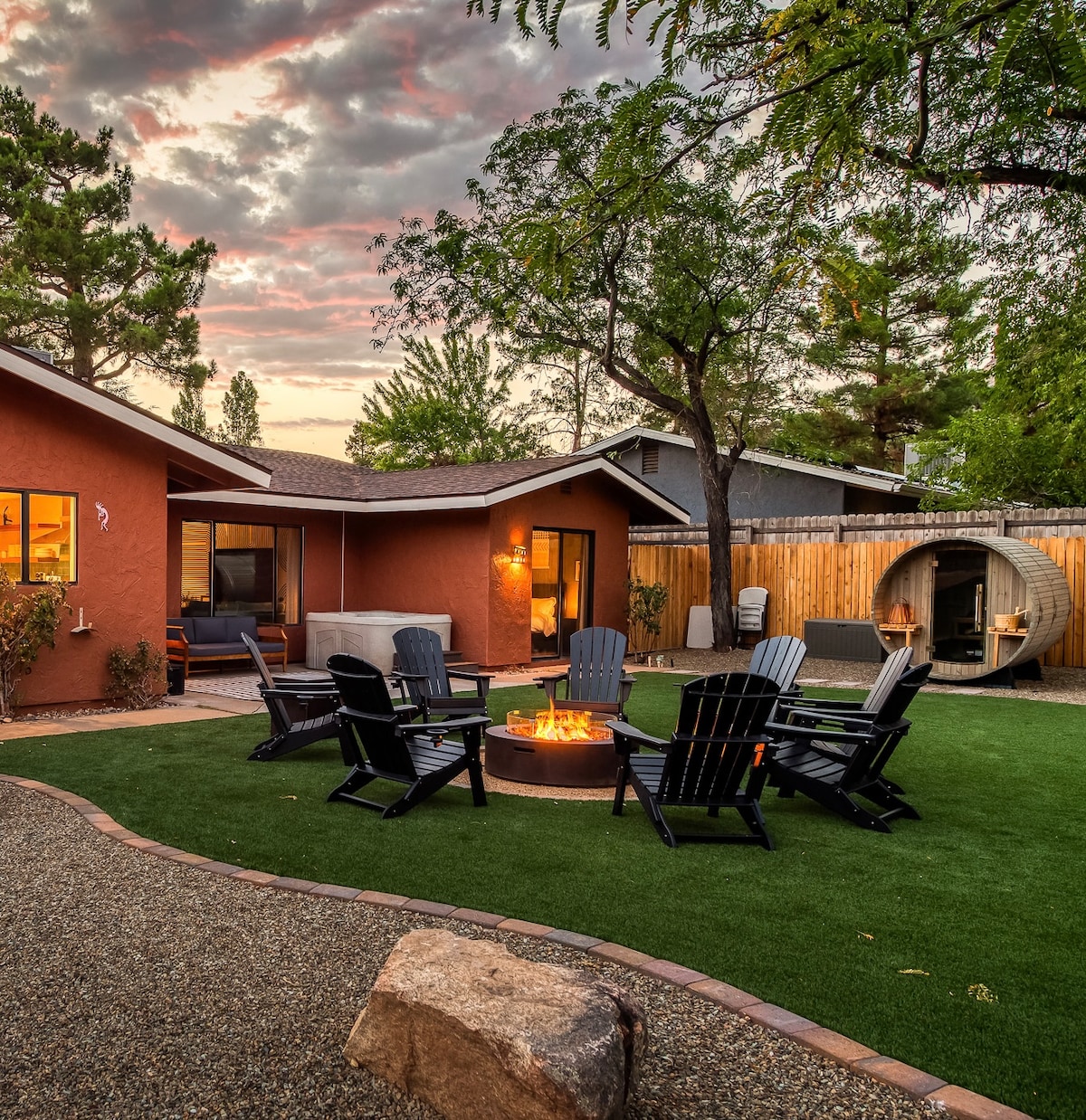 ¡Escápate a tu refugio de roca roja en Sedona! Ubicada entre formaciones icónicas, nuestra cabaña cuidadosamente diseñada se encuentra en un barrio tranquilo con senderos cercanos. Patio completamente cercado para que las familias se relajen y jueguen. Los espacios abiertos, las acogedoras habitaciones y los baños inspirados en el spa crean un telón de fondo sereno para una estadía inolvidable. Ubicado a pocos minutos de rutas de senderismo, galerías, tiendas y algunas de las aventuras al aire libre más pintorescas de Arizona, este es el punto de partida perfecto tanto para relajarse como para explorar.