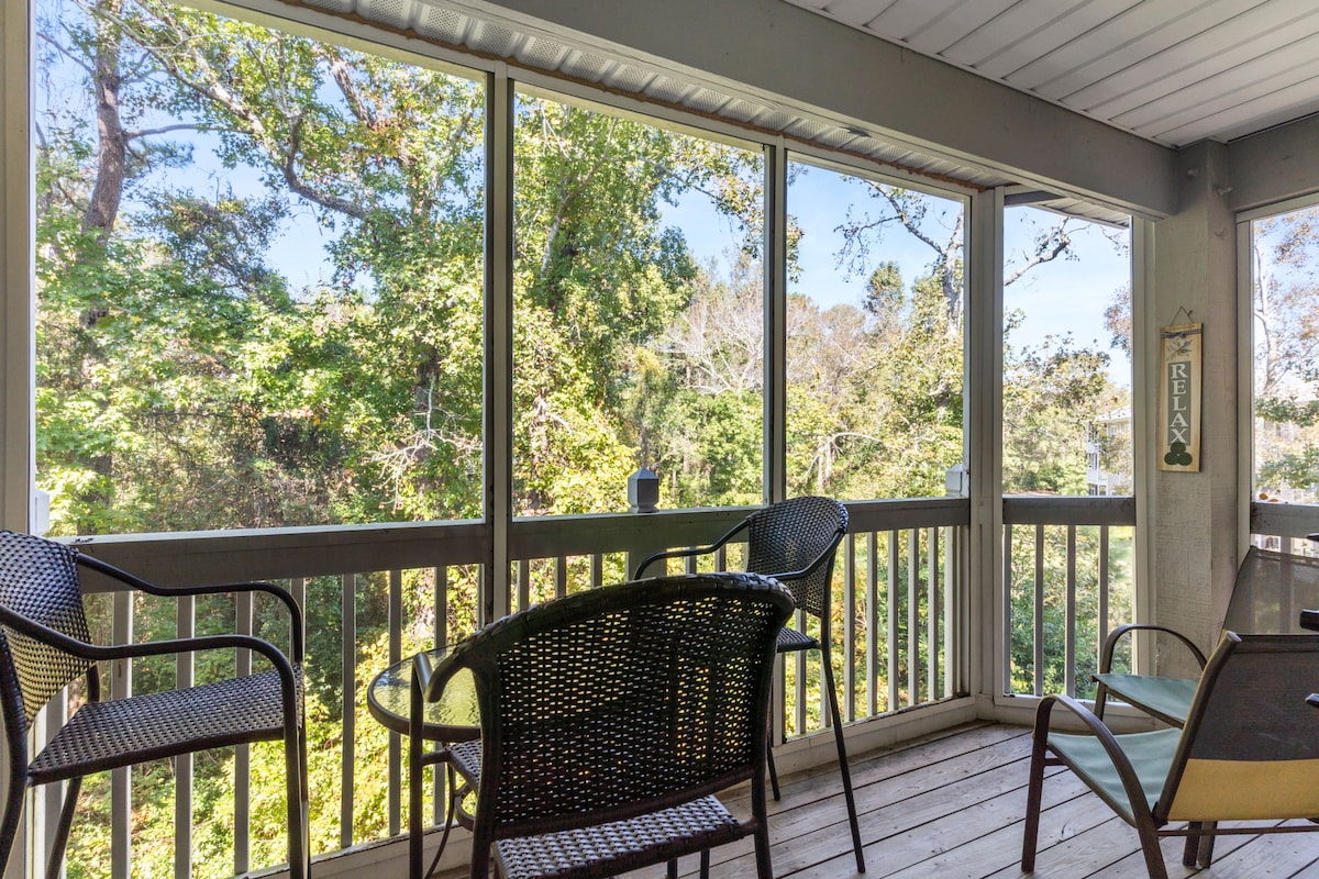Totalmente en la playa - La unidad n.º 2 es uno de los 4 espaciosos apartamentos ubicados a una manzana de la playa y a 2 manzanas del muelle de pesca en el corazón del histórico Cherry Grove. Cada unidad tiene 900 pies cuadrados con 2 dormitorios, un baño, cocina completa y sala de estar con acceso al porche delantero y trasero. El porche trasero tiene vistas a un estanque natural repleto de aves zancudas y otra vida silvestre. Los huéspedes cuentan con lo esencial: ropa de cama, toallas/ropa de baño, utensilios de cocina y cafetera Keurig. La unidad n.º 2 está en el segundo nivel a la derecha.