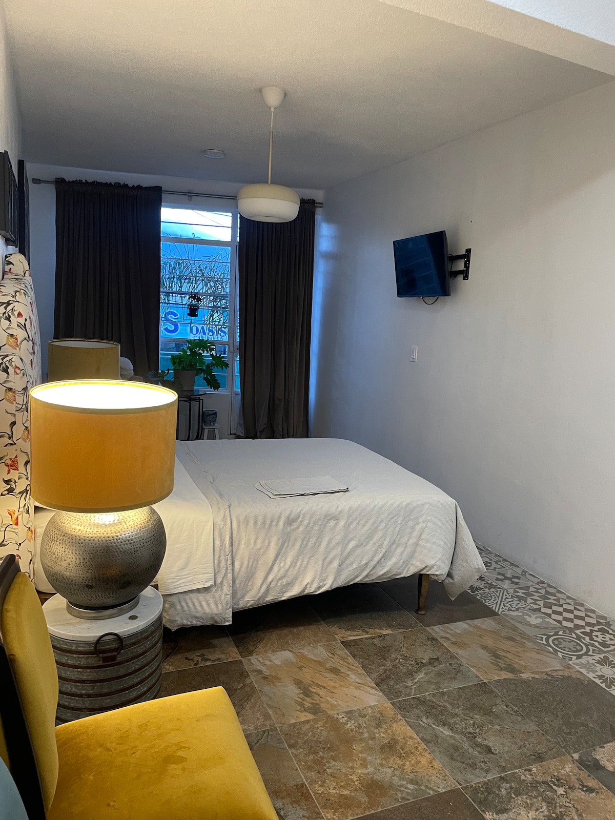 Disfrutarás cada momento en este acogedor departamento amueblado de una habitación, baño propio, cocina, sala y barra comedor, además todos los servicios ,wifi y café, ubicado en el centro de Oaxaca, tendrás acceso a la alberca en areas compartidas ¡Vive la experiencia de vivir en el centro histórico con todas las comodidades! Este departamento se encuentra dentro de hostal familiar, tiene su propia puerta de entrada. Para 2 personas 1 cama king size para 3 personas se agrega una cama individual