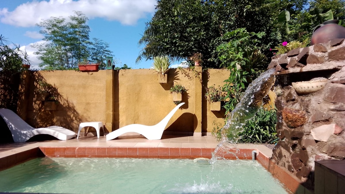 Disfruta de los sonidos de la naturaleza cuando te quedes en este lugar único. dotado de piscina, laguna granja con animales propios de granja y exóticos con museo a cielo abierto en esta cabaña totalmente equipada para que experiencia en Oberá sea inolvidable