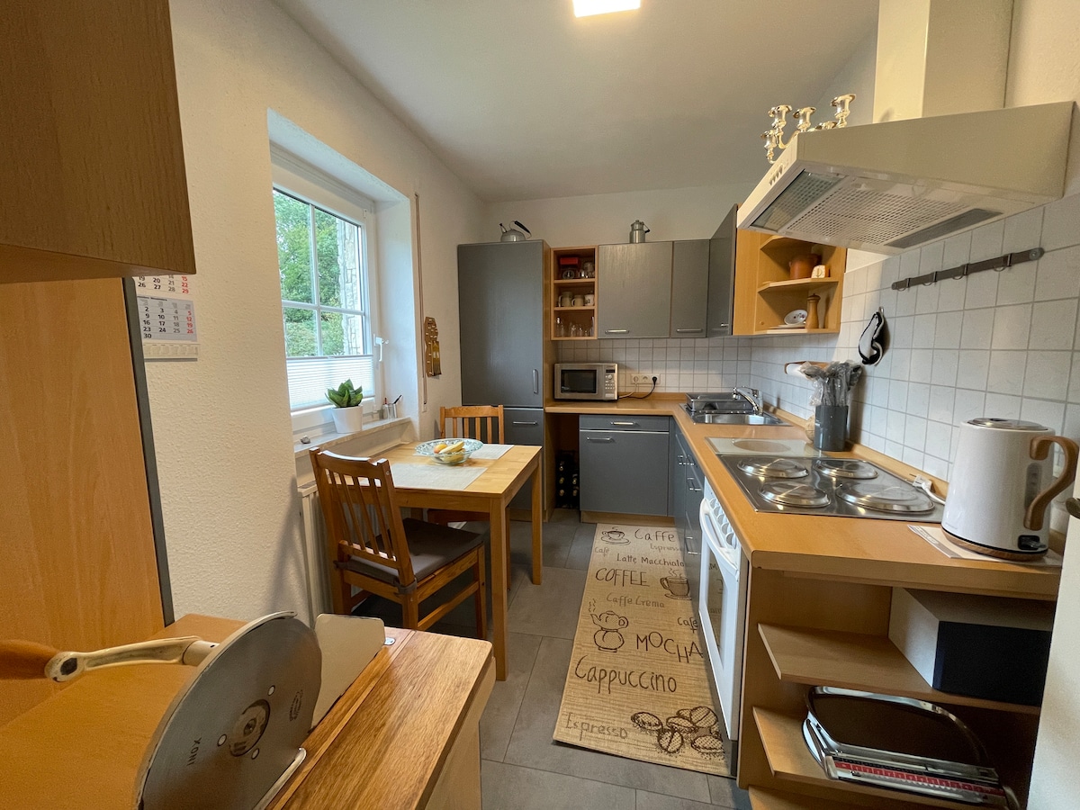«EN EL ESTABLO» se encuentra en la planta baja del granero de la propiedad del molino. Antiguamente era un establo.(Echa un vistazo también a mi otro apartamento «Scheunen-Loft».) La habitación tiene techos bajos y pequeñas ventanas con travesaños. El espacio es adecuado para personas que buscan un refugio más acogedor y acogedor. Debido a la estufa y al suelo frío, el apartamento no es adecuado para niños pequeños. En la temporada de frío, puede ser necesario calentar con la estufa. Ver abajo.