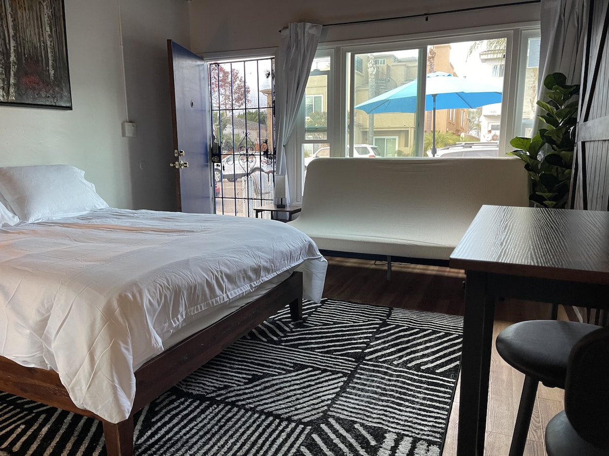 PB Bungalow is a bright, well-equipped private beach studio in the heart of Pacific Beach, just a 5-minute walk to the calm Mission Bay beaches. The space features a queen bed with crisp white linens, a modern black-and-white rug, a cozy futon, and large windows that fill the studio with natural light. Enjoy a private entrance, turf patio with BBQ and picnic table, full kitchen, and clean, comfortable private bathroom. Ideal for solo travelers or couples seeking a relaxed, walkable PB stay.