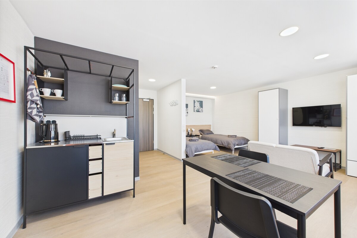 Piedāvājumā ir vienas istabas dzīvoklis 4. stāvā. Studio tipa dzīvoklis ir aprīkots ar mini virtuvi un divām divguļamām gultām (90x200 cm), lai varētu baudīt vakarus kopā ar ceļabiedriem. Gultas var novietot atsevišķi vai kopā. Virtuve aprīkota ar mikroviļņu krāsni un grila funkciju, ledusskapi, tējkannu; ātrs WiFi un televizors, ērts dīvāns vai atpūtas krēsls; moderna vannas istaba ar atsevišķu dušu, fēnu. Īpašumā ir profesionāli aprīkota koplietošanas virtuve un veļas mašīna.