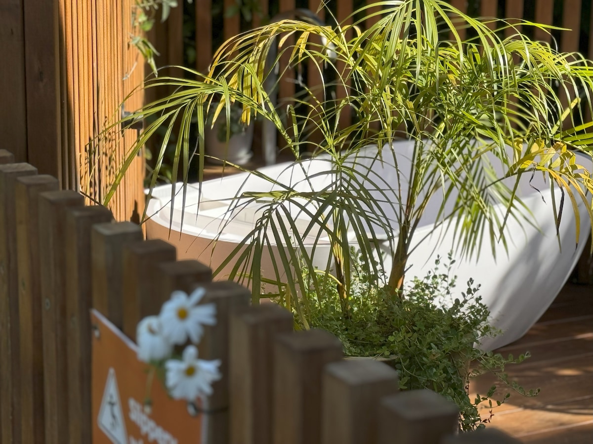 Relájate en este espacio tranquilo y elegante. El estudio está separado, totalmente vallado, encantador y privado. Incluye un pequeño y relajante área de jardín zen. El televisor tiene todas las suscripciones. La cocina tiene microondas, tostadora, cafetera Nespresso, cápsulas de café, hervidor y nevera. La impresionante playa de surf Oakura y la pizzería Black Sand están a solo 15 minutos a pie, el pequeño y lindo pueblo de Oakura, cafeterías y restaurantes, a 12 minutos a pie y Kaitake Ranges a 15 minutos a pie.