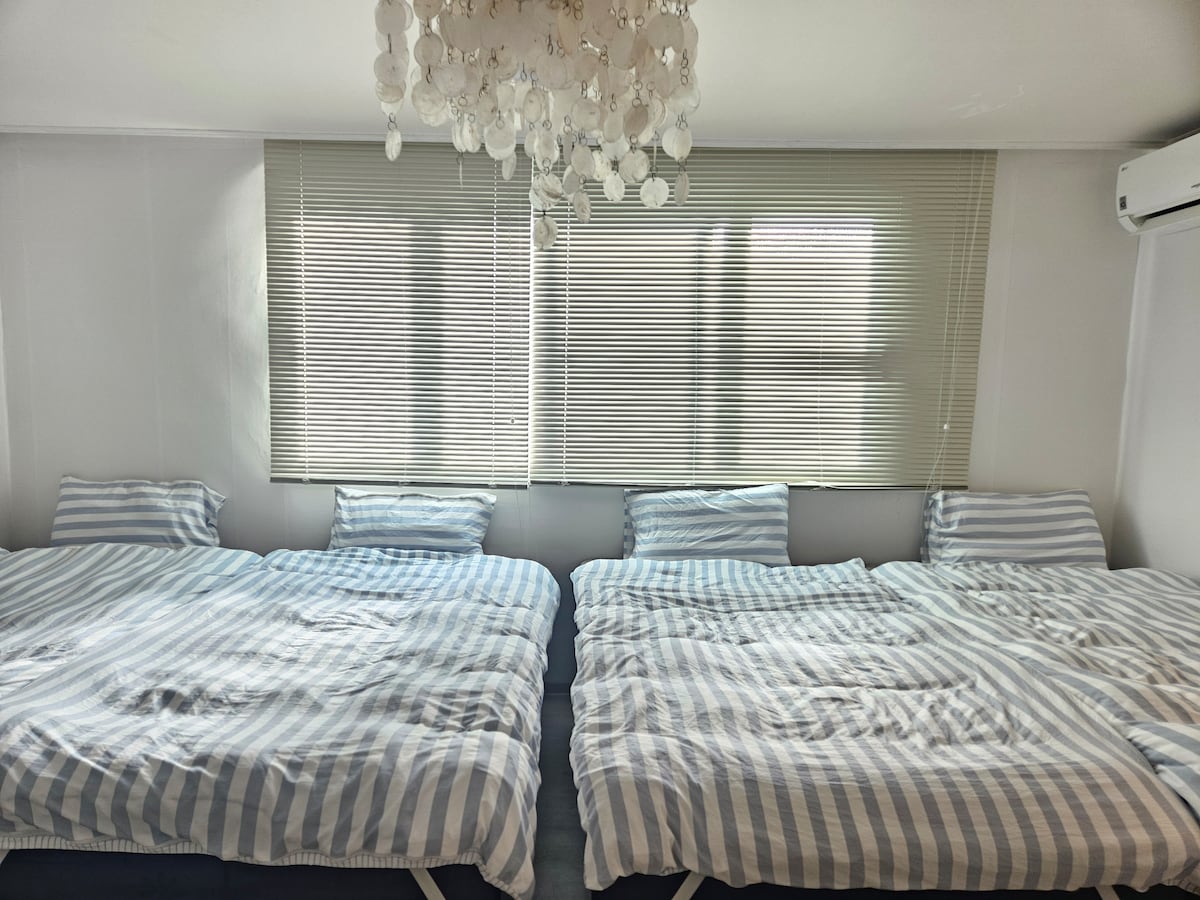 💜 신축건물 조용한 주택 2층 입니다. 💜 깨끗하고 사랑스런 컨셉의 퀄리티있는 숙소를 거품없는 가격으로 제공하고 있습니다. 💜 23평 넓고 쾌적한 공간. 호텔식 침대 및 침구. 6인 대형 테이블이 마련된 독립 다이닝룸. 50인치 스마트 TV (유튜브, 넷플릭스, 티빙 개인계정 시청가능) 💜 예약인원 외 추가인원 입실 불가. 적발시 환불 없이 즉시 퇴실 조치 (방문인원 입실불가 ) ※ 공동현관 CCTV로 체크합니다. 💥1~2인 예약시 : 침실1 또는 침실2 중 선택 (기본 침실1 제공) 제공외 침실 CLOSED 침실1, 2 모두 사용시 1박당 3만원 추가요금 발생 💥 3인 예약시 : 침실1 + 침실2 (슈퍼싱글 침대) 💥 4인 예약시 : 침실1 + 침실2 (슈퍼싱글+싱글침대) 🍒 5인 예약시 : 모든 침실 + 토퍼 💜 변기에 물티슈 사용 불가 입니다. 변기가 막힐 경우 수리비 50만원 청구 됩니다.