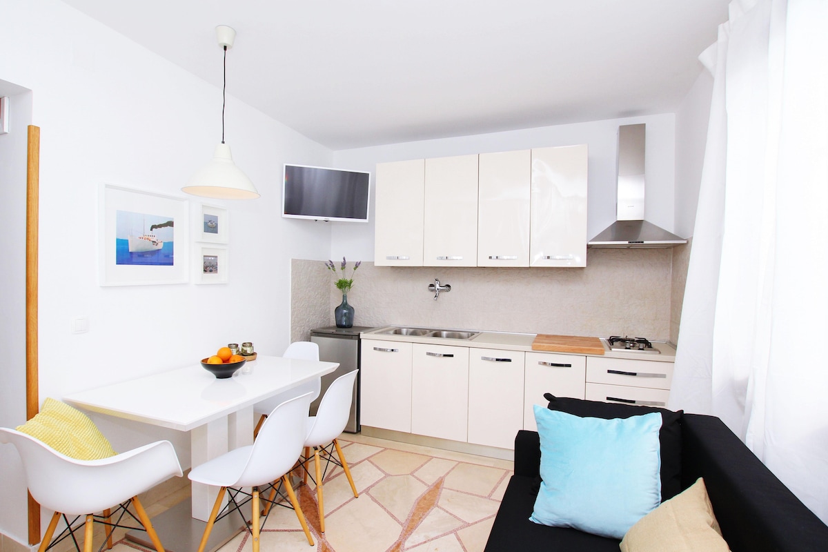 Royal is new, modern & luxury renovated apartment with jacuzzi, 50 meters away from beach. Has 50 square meters and 30 square meters terrace. Comes with 2 bedrooms, a living room, a fully eqipped kitchen with a dining area, bathroom with great shower, barbecue facilities, garage(1 car) , flat-screen TV in every room and free wi-fi. Offers a big terrace with open sea view on surrounding islands. Diving can be enjoyed nearbly. Trogir is 5 km away and Split airport 8 km from the acommodation.