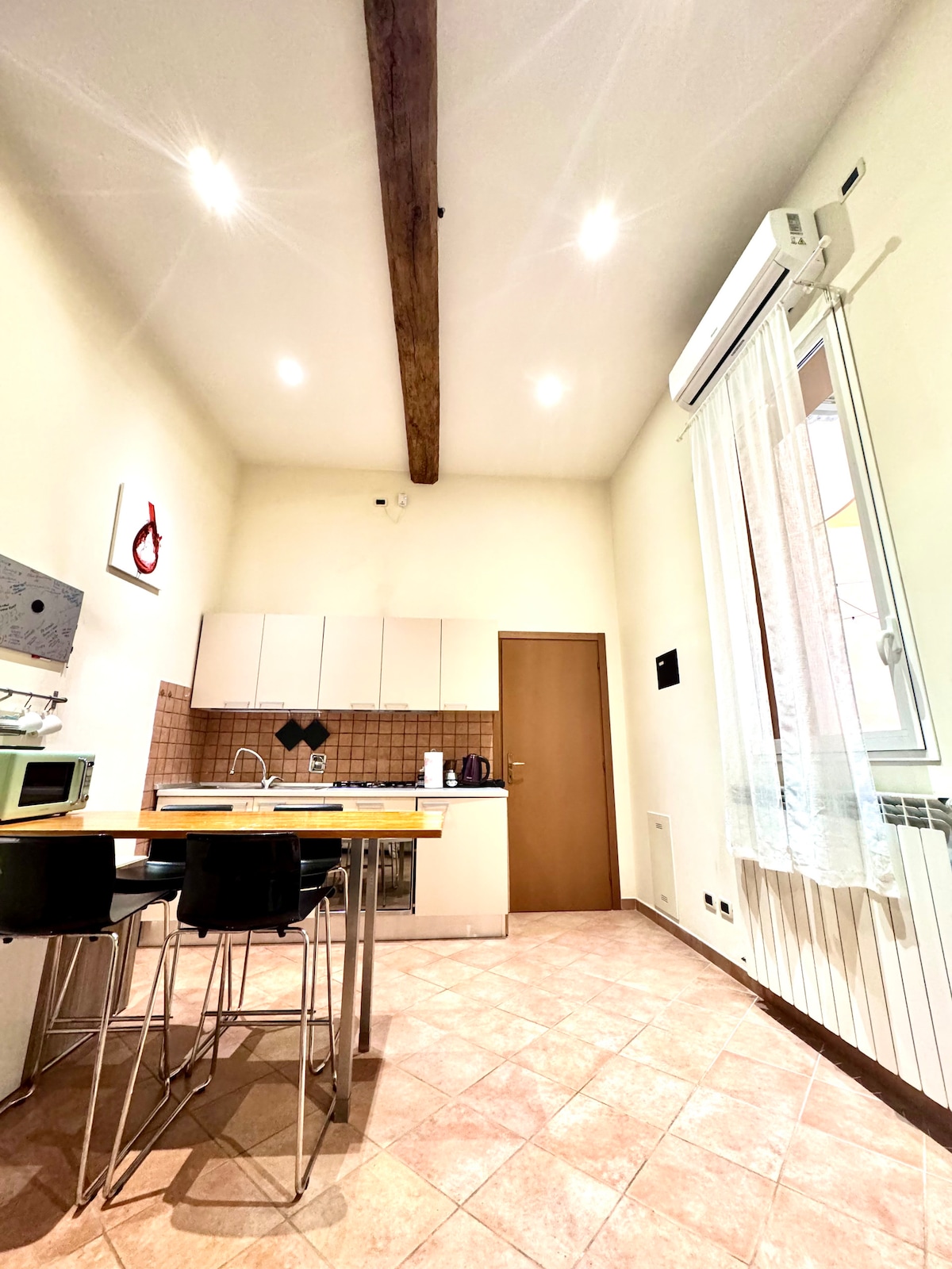Elegante y silencioso estudio situado en un edificio típico del centro histórico de Bolonia, completamente renovado y amueblado en 2020. El apartamento consta de un amplio y luminoso estudio con una romántica chimenea de piedra natural. Cuenta con una cocina americana con placa de inducción y está totalmente equipada. El baño está equipado con una gran ducha y hay una lavadora a disposición de los huéspedes. El apartamento está totalmente climatizado y equipado con Smart TV (40 pulgadas) y wifi.