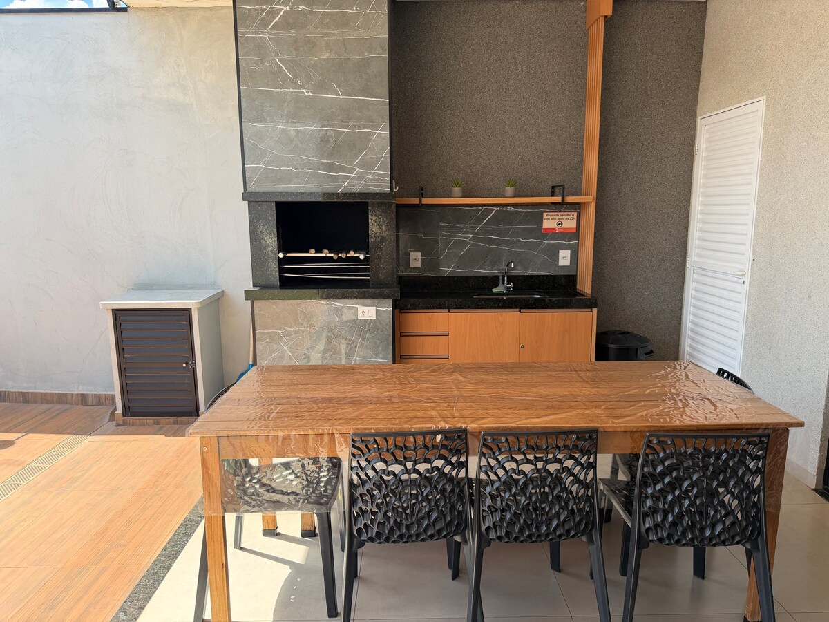Tiene una piscina con calefacción eléctrica, bañera de hidromasaje y cascada, zona de barbacoa, 3 dormitorios, 2 de los cuales son privados independientes, todos con aire acondicionado y ventiladores de techo, baño de invitados, cocina equipada, sala de estar con TV por cable, Wi-Fi y garaje para 3 vehículos. Está muy bien ubicado, cerca de la panadería, carnicería, pastelería, hamburguesa y esfirraria; a 500 metros del supermercado y de 7 a 10 minutos de los parques, ruta de fácil acceso.