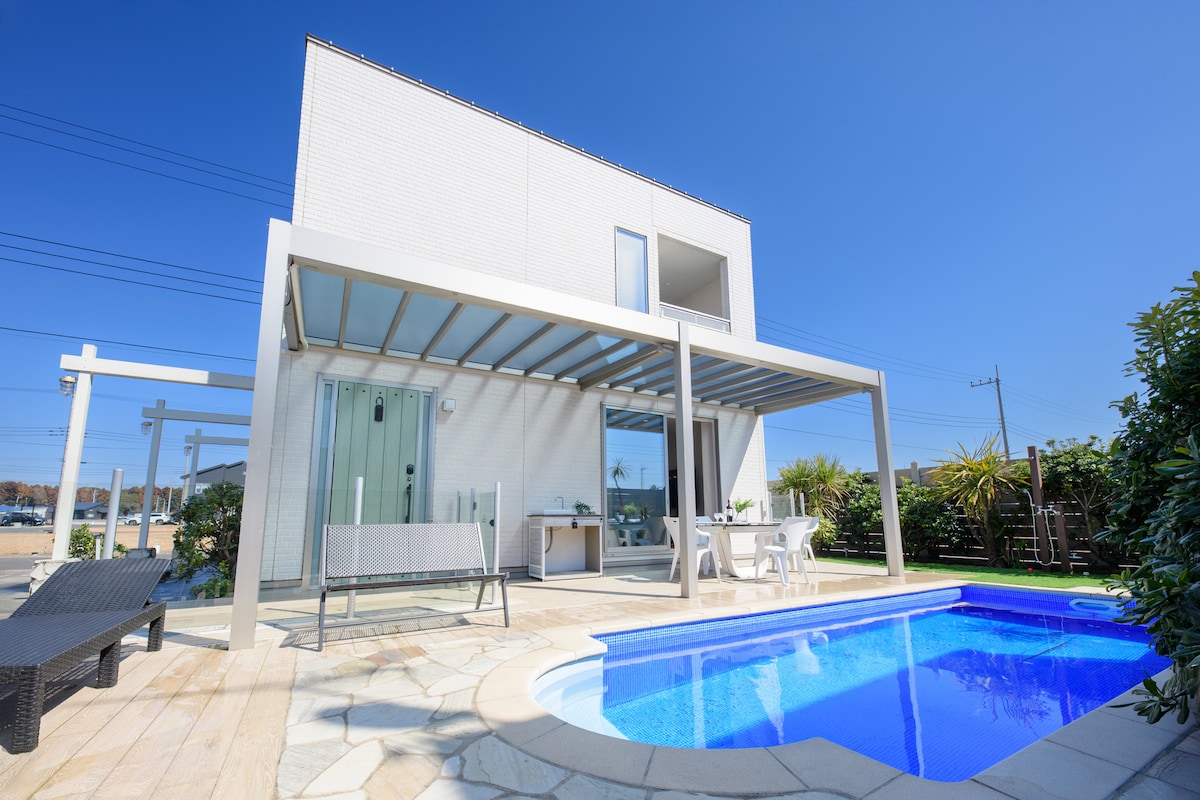Located 15 minutes from Mito Station and Oarai Beach, 【POOL VILLA Mito B】is a spacious 2LDK villa with a tropical atmosphere and pool, perfect for family and friend getaways. It offers free parking and long-term stay options. The villa features two bedrooms with TVs, and child-friendly amenities. Relax in the spacious living area or pool, and enjoy a luxurious escape at POOL VILLA Mito B.