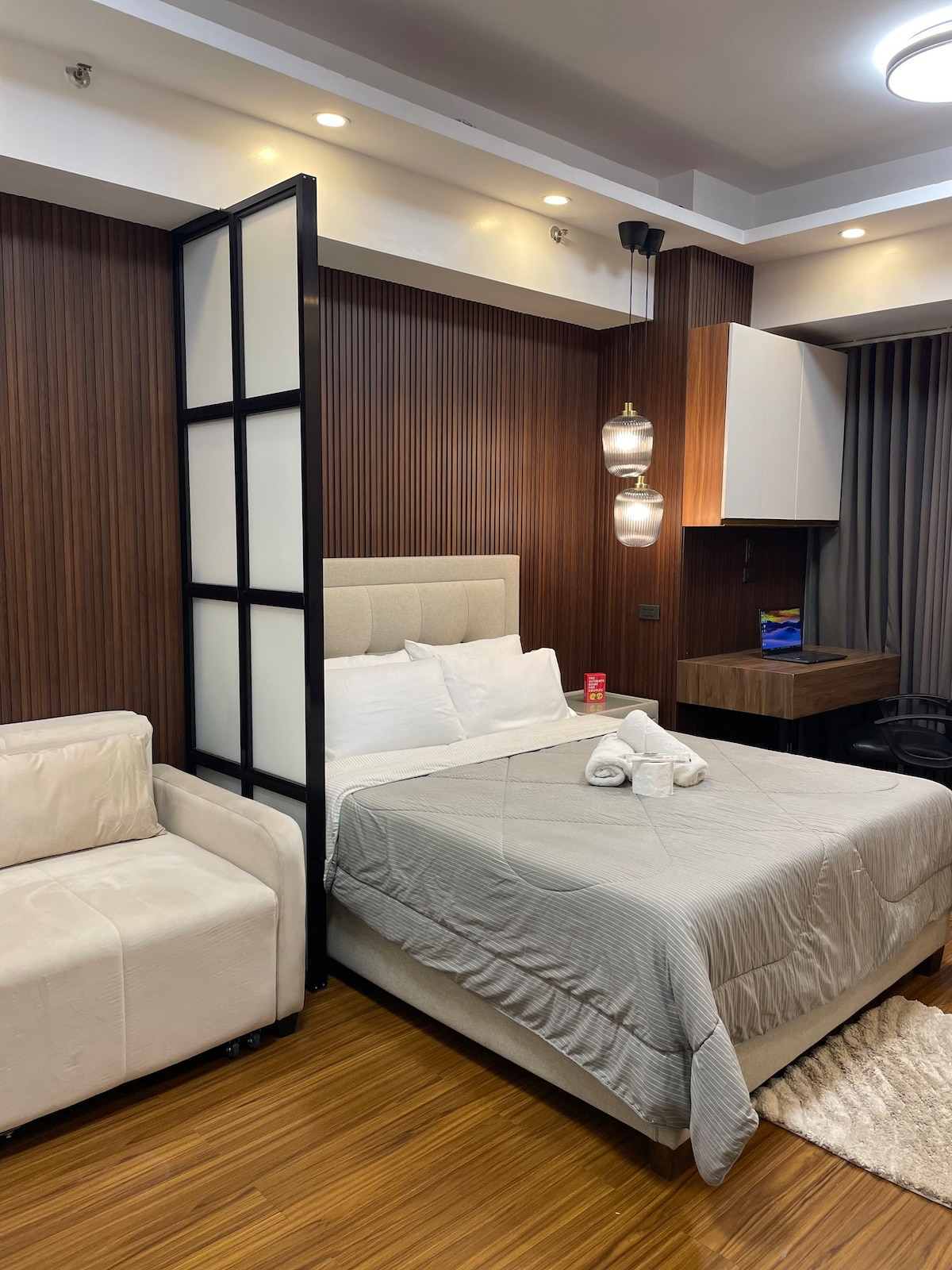 [Haz clic en Mostrar más para obtener más información]. Two Palm Tree Villas se encuentra al otro lado de la Terminal 3 de Naia. Unidad de estudio de condominio totalmente amueblada (31 metros cuadrados), lugar seguro y céntrico: Televisión inteligente ● de 55 pulgadas (Netflix y YouTube Premium) Configuración ● de doble proveedor de Internet ● Ten espacio para hacer las maletas ● A 4 minutos a pie de la iglesia de Santa Teresa A ● 5 minutos a pie del puente Runway Manila-Terminal 3 ● A 8 minutos a pie del supermercado Metro ● A 8 minutos a pie de Resorts World/Newport Mall A ● 10-15 minutos en coche de la terminal 1, 2 y 4