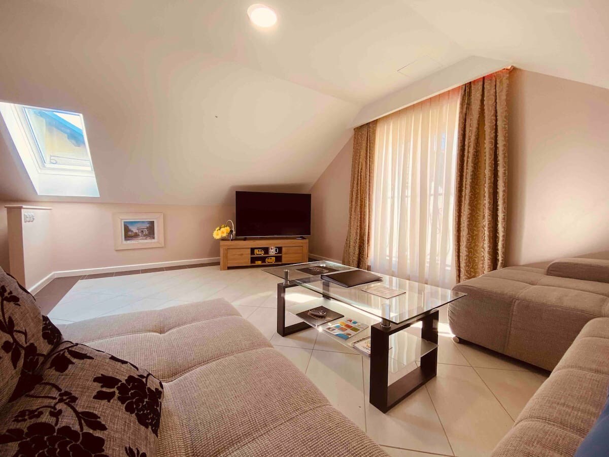 Ático de lujo totalmente equipado a solo 50 metros del centro de la ciudad. Alojamiento cómodo con 2 dormitorios (1 cama doble, 1 cama doble o 2 camas individuales), 2 camas adicionales posibles, una cocina equipada con nevera, lavavajillas, horno, microondas, comedor grande y sala de estar, 1 baño con baño y toillete adicional, TV plana con taxi, Internet, aire acondicionado, calefacción central, gran terraza con hermosas vistas a la ciudad.