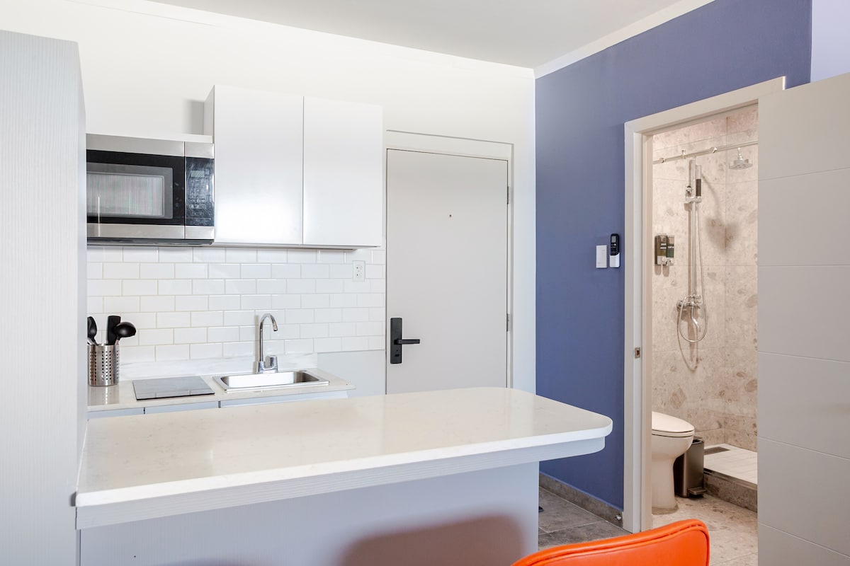 This beautiful studio reflects Aruba's blue colours with a very Modern and CLEAN design, offering a very comfortable KING size bed & King size pillows, a fully functional kitchen, beautiful walk-in closet, modern bathroom with a spa like Rainfall shower. Located on the highest floor of the building with a stunning view of downtown Aruba as well as the harbour! Enjoy the infinity pool and rooftop hot tubs with 360 view and state of the art gym overlooking the water and cruise ships!