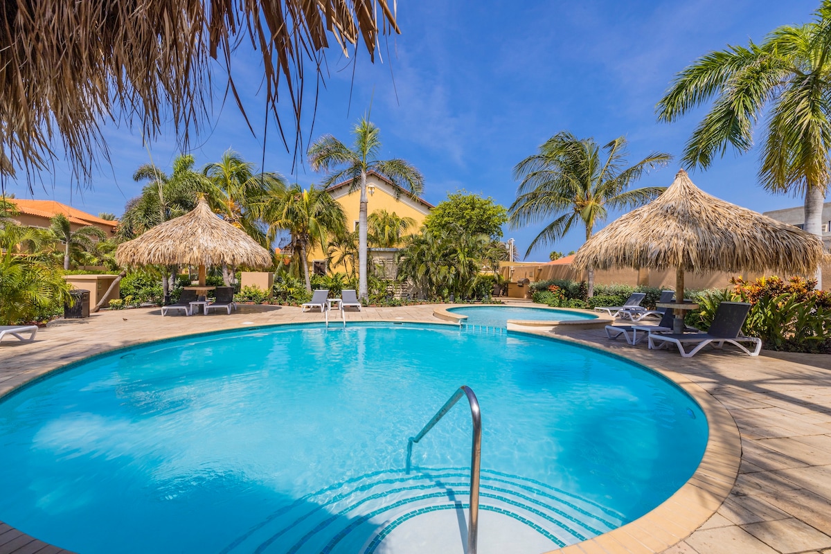 ¡Relájate y desconecta en este alojamiento tranquilo y elegante que está a tiro de piedra de Eagle Beach! ¡Incluso tenemos un carrito para que puedas llevar tu nevera llena de delicias, tumbonas, toallas de playa e ir a disfrutar de un maravilloso día en la playa! ¡La hora feliz en el bar de la playa es imprescindible! ¡Relájate en casa junto a la piscina rodeada de un hermoso oasis tropical! También hay un gimnasio, barbacoa y comedor al aire libre. Personalmente, ¡disfrutar de la cálida brisa caribeña en los sofás al aire libre es nuestro favorito!